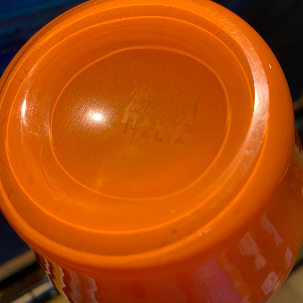 Vaso in vetro soffiato nei toni dell’arancio. La forma di questo vaso è riconducibile con la n. 3907 del catalogo Venini disegnata negli anni Trenta da Carlo Scarpa e poi ripresa da Paolo Venini attorno agli anni Cinquanta. L’esemplare presentano è ascrivibile alla produzione della metà del secolo, in coerenza anche con la firma ad acido impressa.