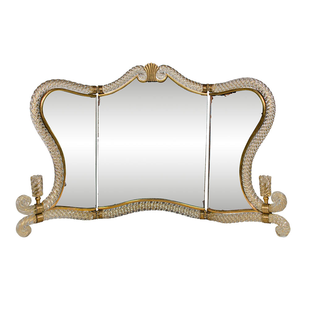 Specchiera da tavolo con cornice e portacandele a coste ritorte in vetro cristallo con inclusioni d’oro, 1937.