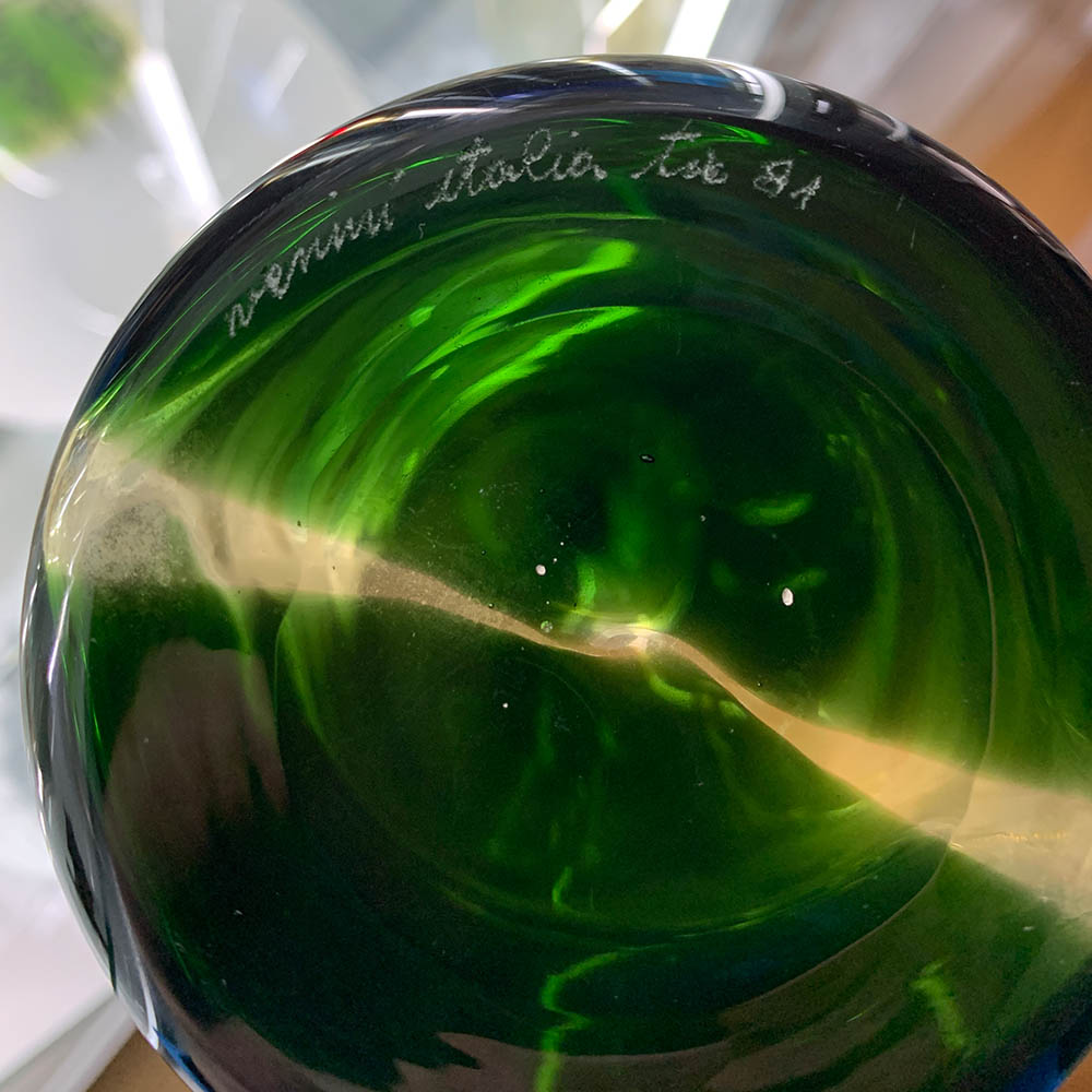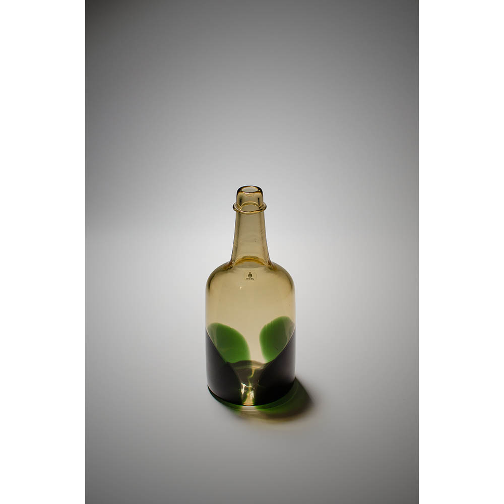 Bottiglia della serie “Pavoni” in vetro talpa con decorazione a macchie verdi, 1981.