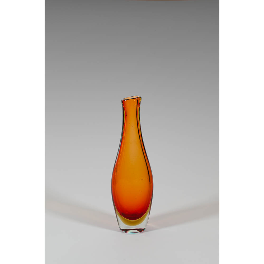 Grande vaso a sezione ovale in vetro pesante a colori sovrapposti nei toni del corniola. La forma di questo vaso è riconducibile al modello n. 3899 del catalogo Venini;