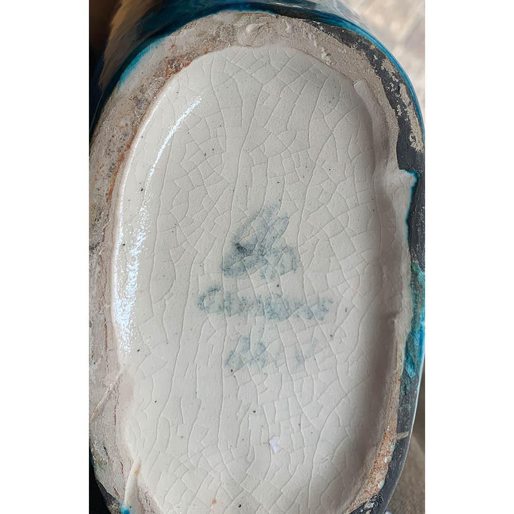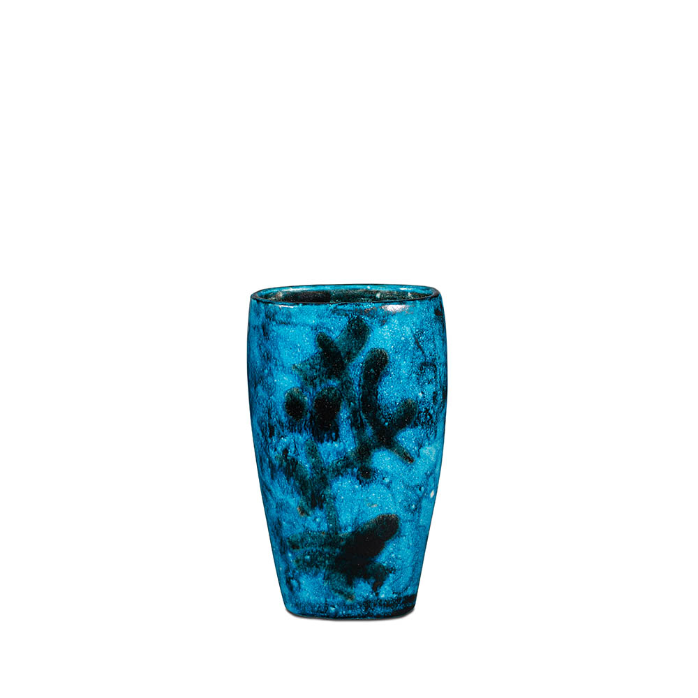 Vaso in ceramica dipinta a smalti nei toni del blu. Firma dipinta sotto la base: Gambone Italy - simbolo dell’asinello