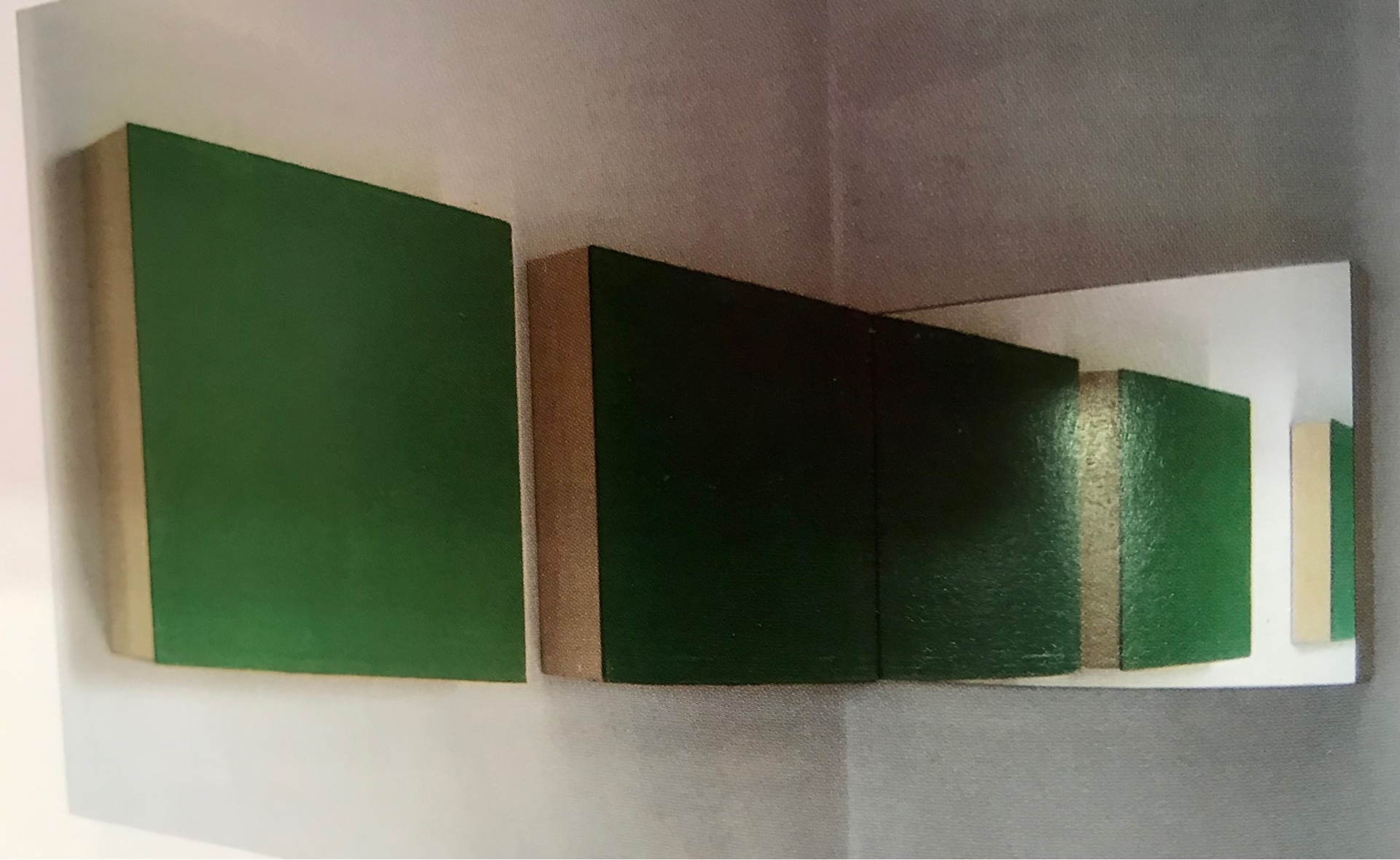 Lucio Rosato, "Dai territori di Narciso: discontinuità riflesse", 2009, specchio e cartone dipinto su telaio di legno, 4 elementi 48x7x24 cm