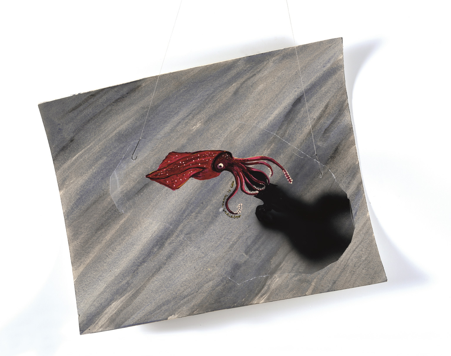 Massimo Ruiu, "Marmosso", 2019, Tempera su cartone, smalto su vetro sintetico, ami da pesca, 70x100x25