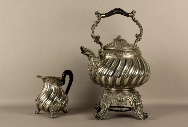 Firmato, datato. Servizio composto da un samovar e una lattiera in argento sbalzato e cesellato, gr. 1550.