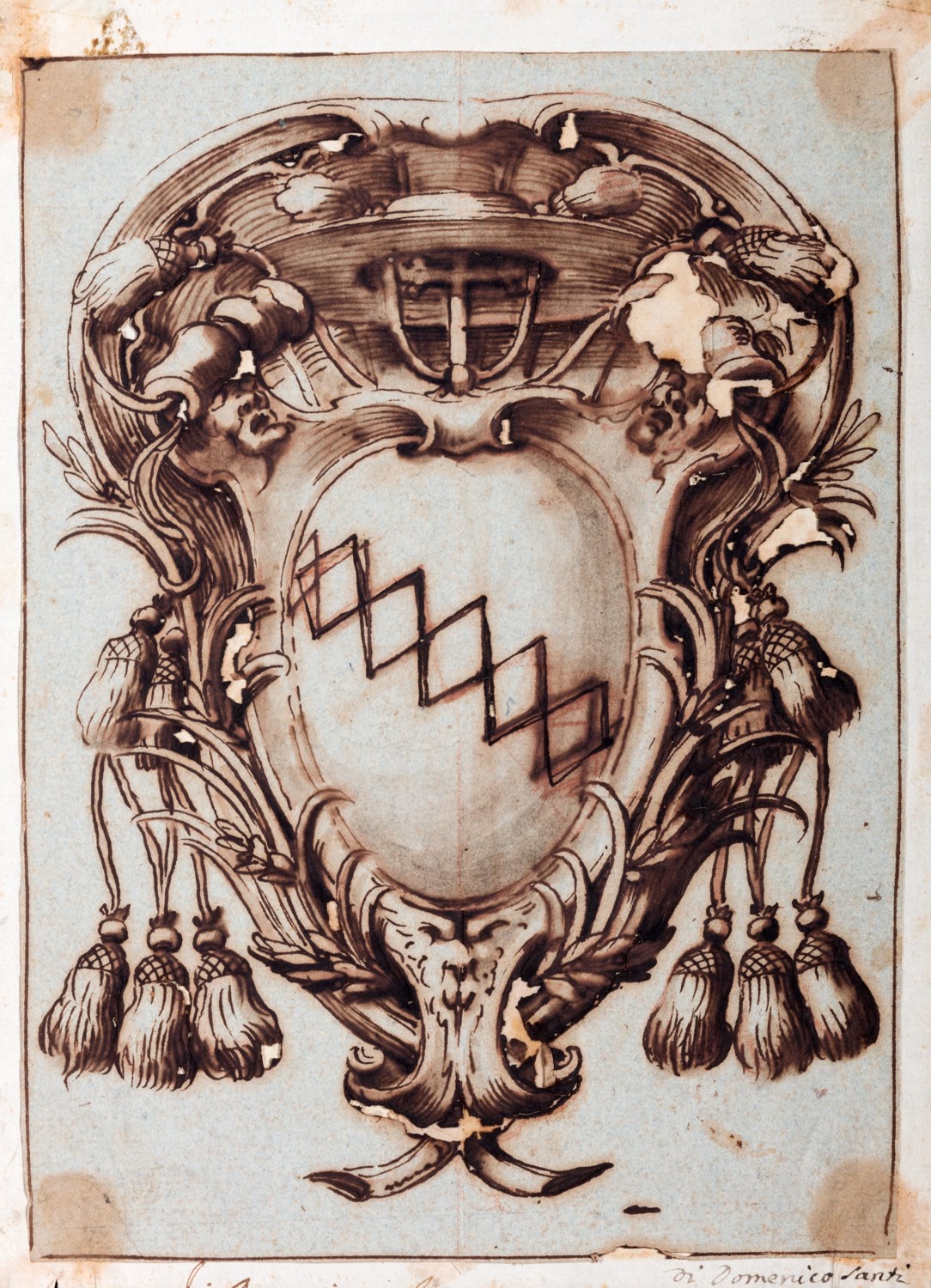 nel lotto un altro disegno di Domenico Santi (Bologna 1621 - 1694), Studio per uno stemma cardinalizio, penna, inchiostro bruno e acquerello su carta azzurrina controfondata (danni e lacune) mm 245 x 175