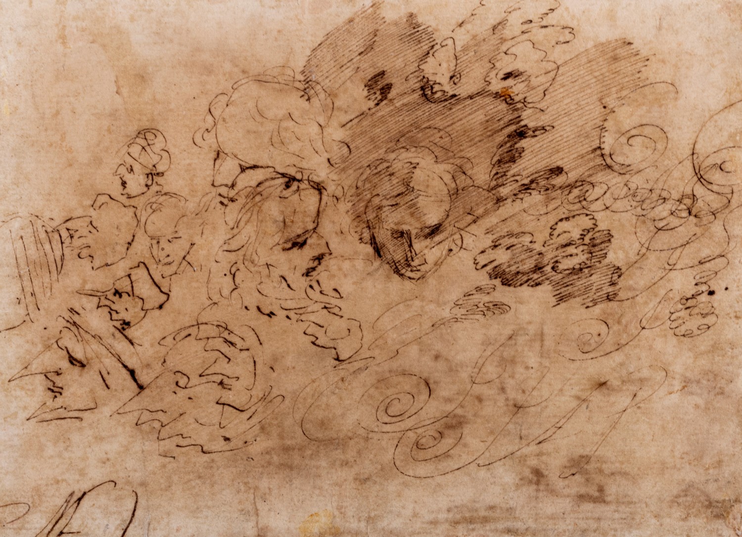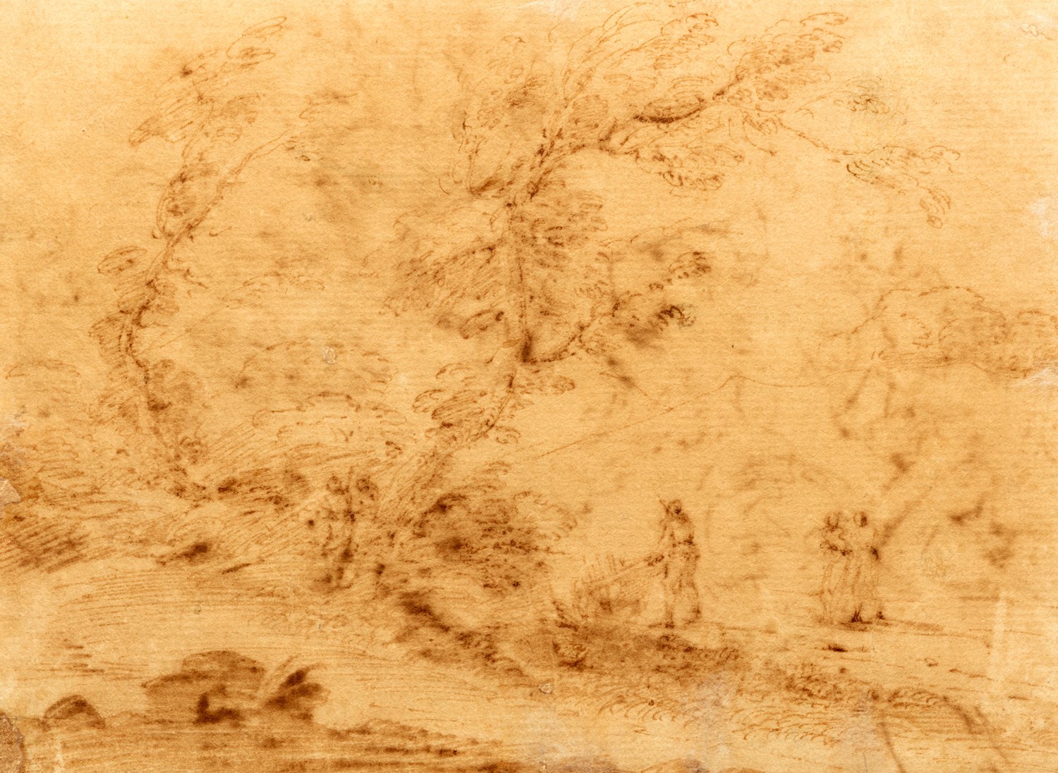 Attribuito a Salvator Rosa (Napoli 1615 - Roma 1673) - Studi di teste (recto); e studio di paesaggio con figure (verso)