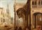 Scuola fiamminga secolo XVII - Capriccio architettonico con architetture gotiche e la Visitazione in primo piano
