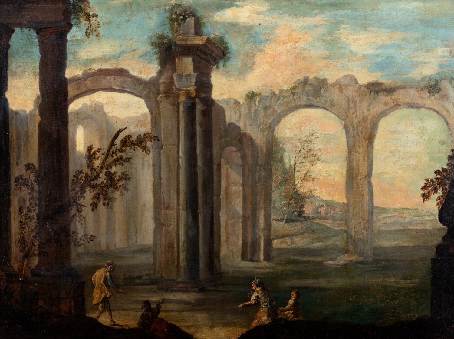 Lotto 142 | Scuola napoletana, secolo XVII - Capriccio con architetture classiche e astanti