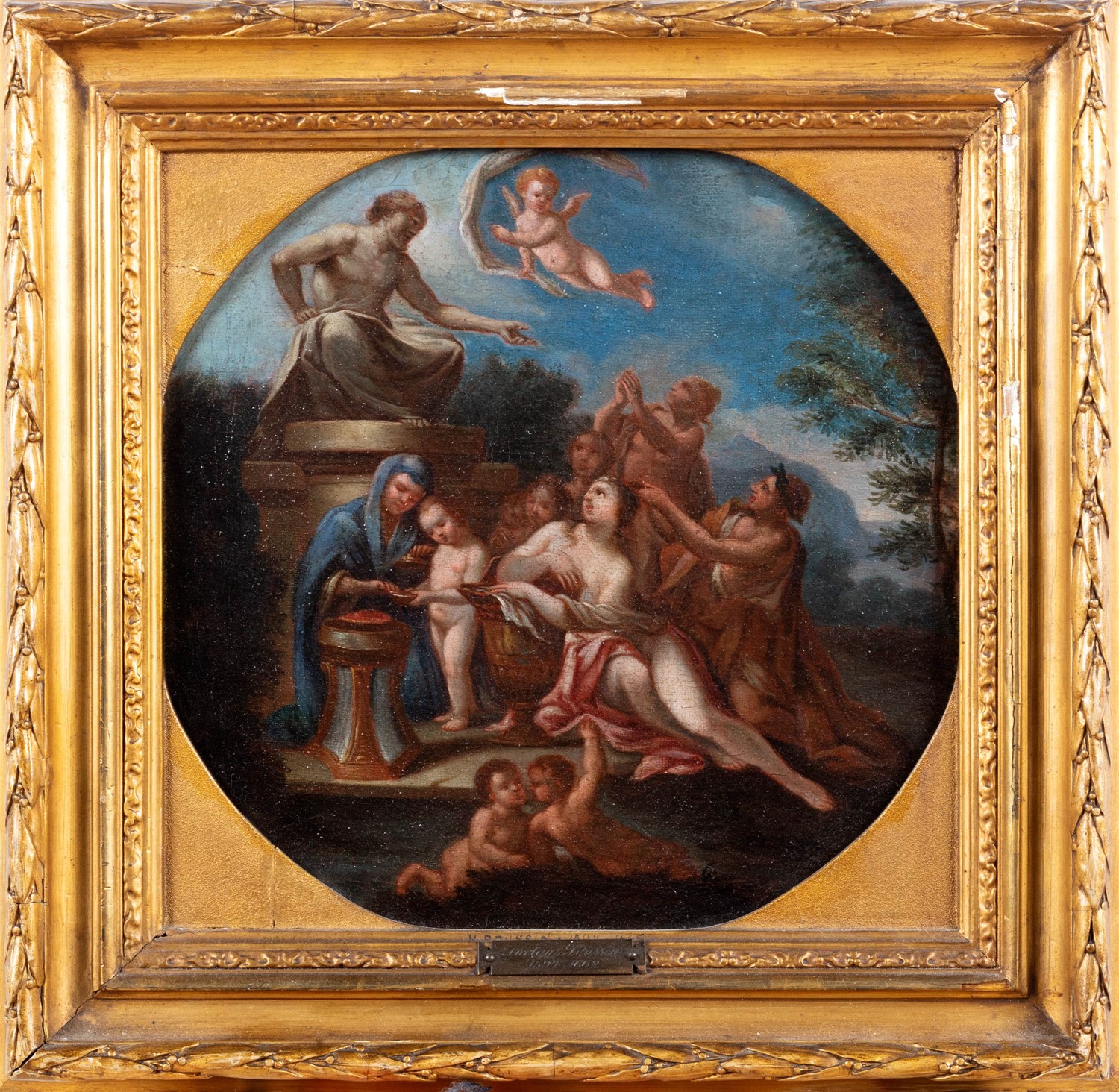 Scuola romana, secolo XVII, nei modi di Nicolas Poussin - Due scene mitologiche: Bacco e Arianna; e Sacrificio ad una divinità pagana