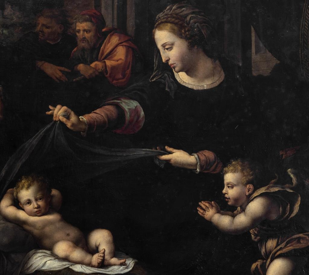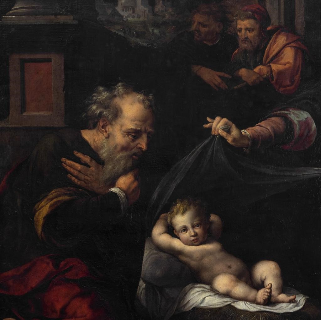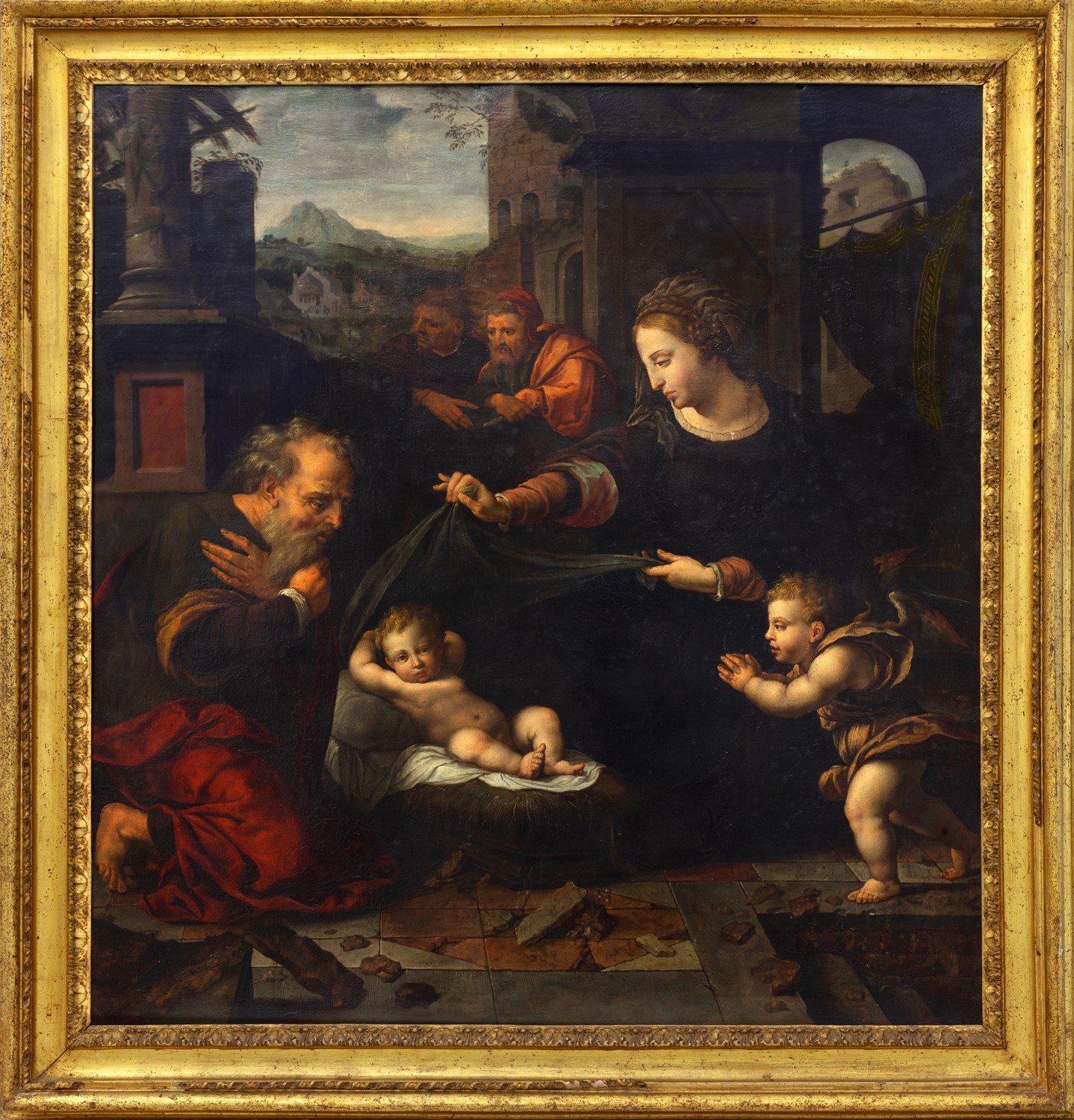 Joos van Cleve (Kleve 1485 - Anversa 1541) e atelier - Adorazione del Bambino