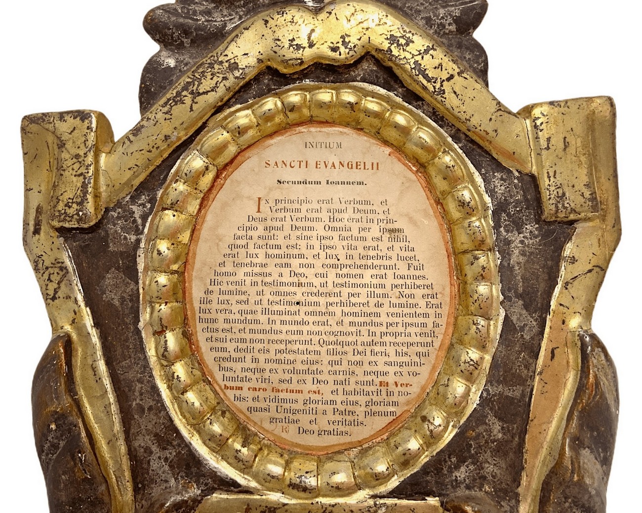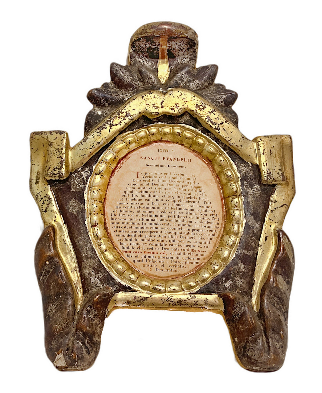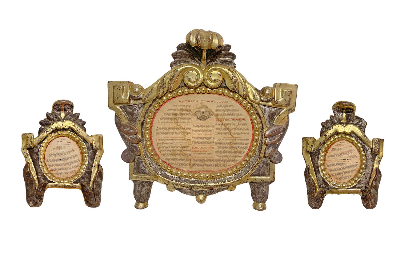 Trittico cartaglorie in legno dorato e argentato a foglia, inizi secolo XIX. Grande cm 45x49, piccole cm 30x23