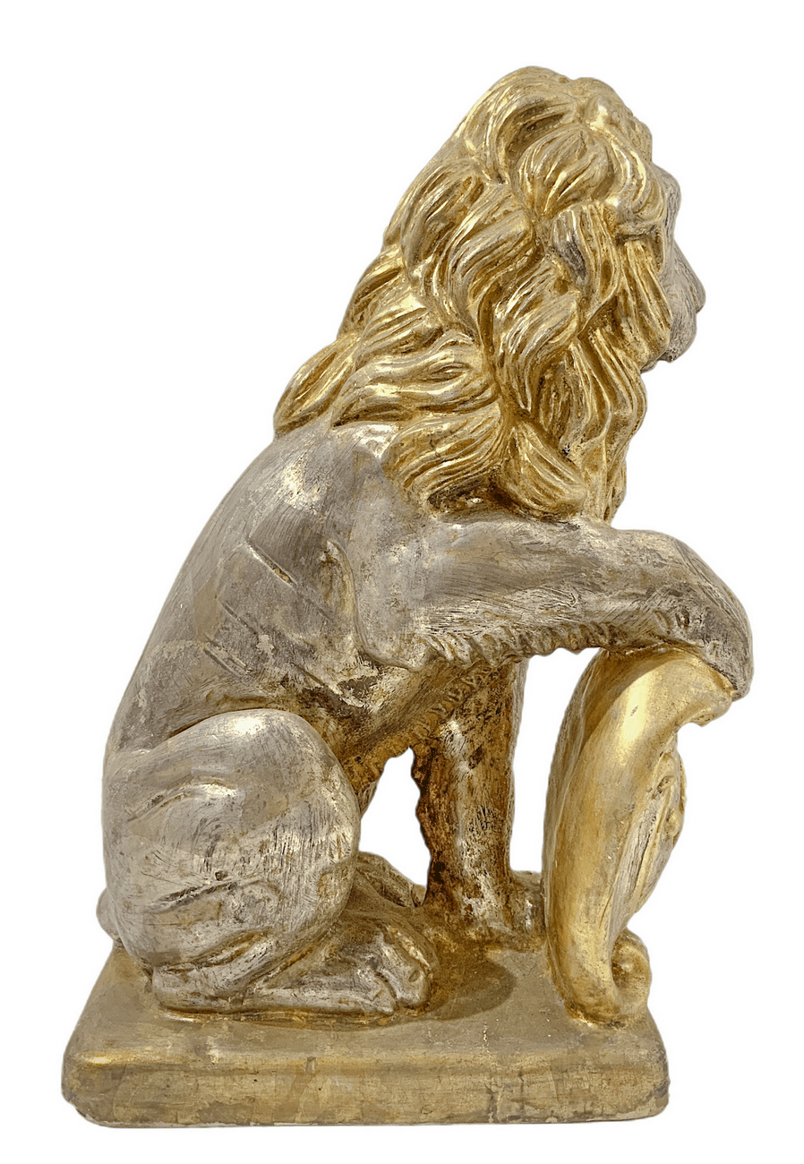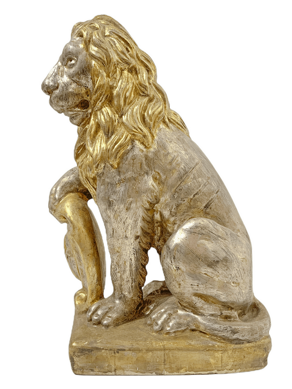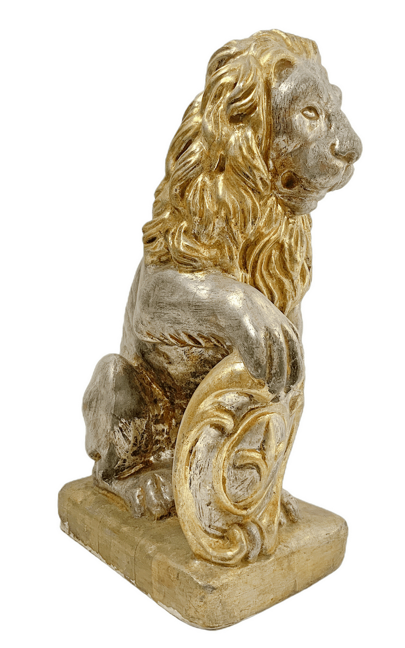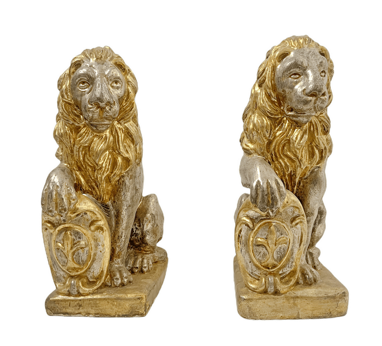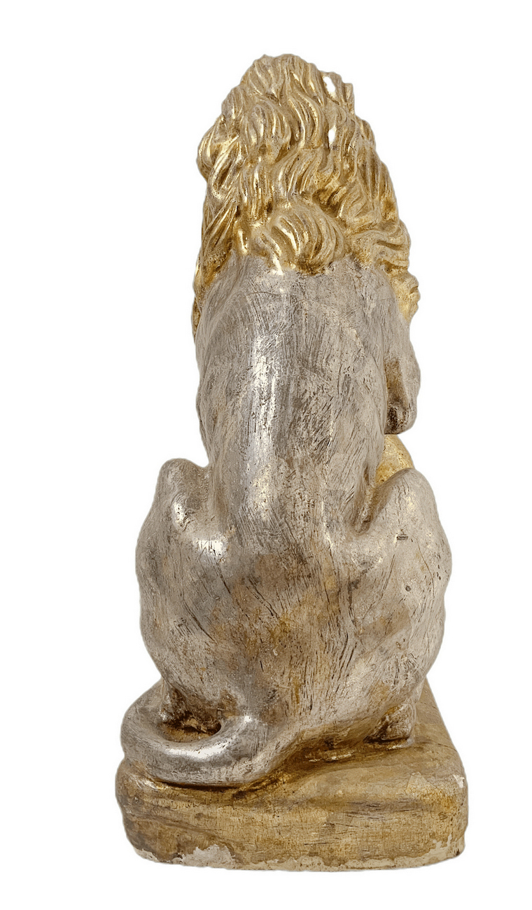 Coppia di leoni Marzocco di Firenze in legno dorato e argentato, inizi XX secolo. H cm 40, base 23x13