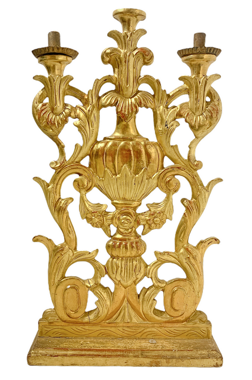 Candeliere a tre luci in legno dorato, fine XVIII secolo H cm 78, base cm 43x15.