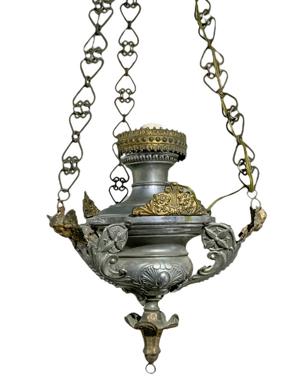 Lampada da chiesa in metallo argentato e dorato, fine XVIII. H cm 58