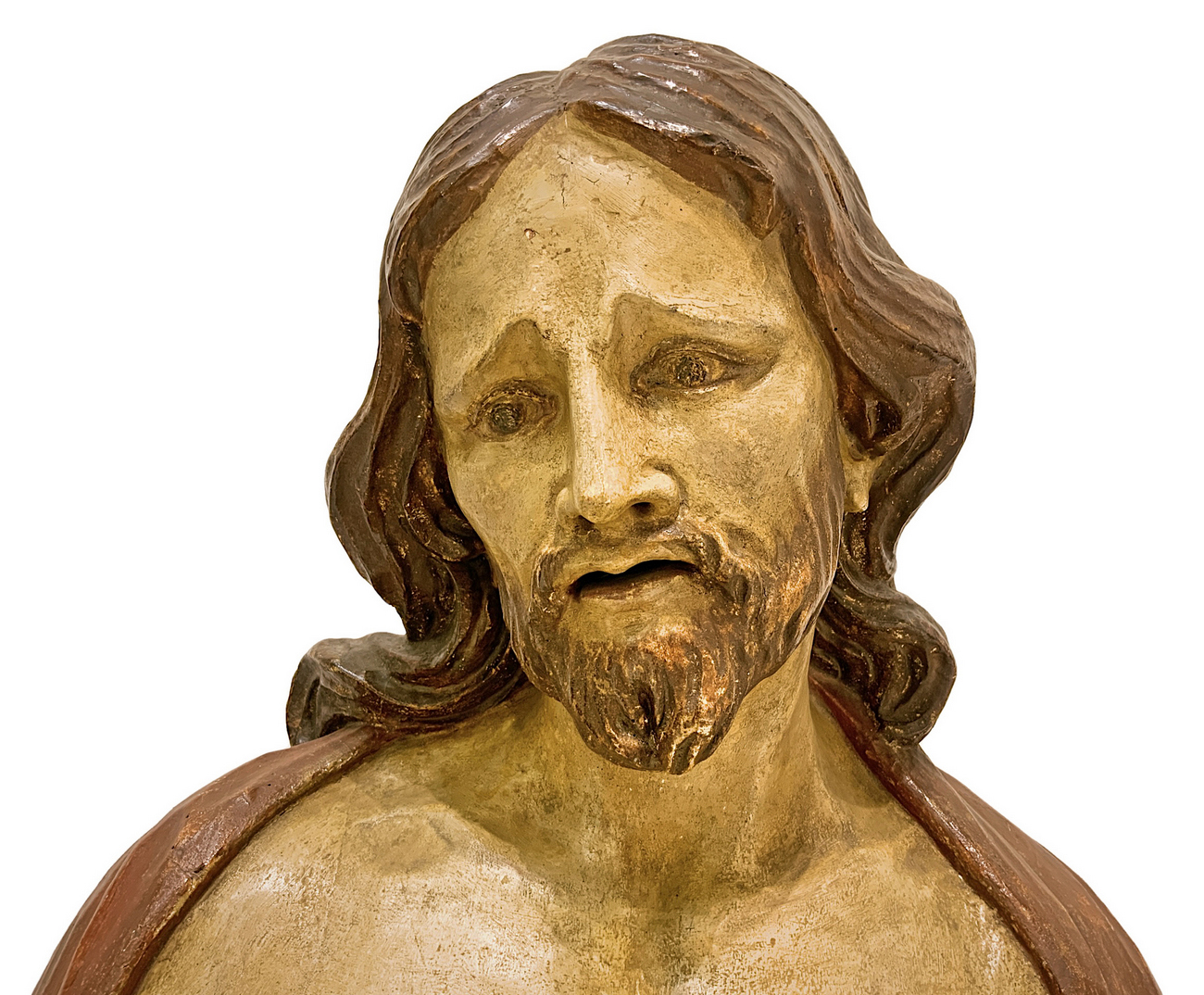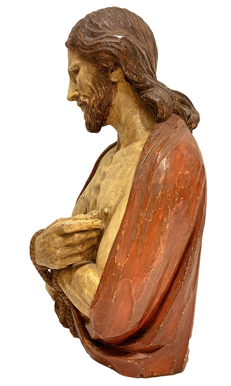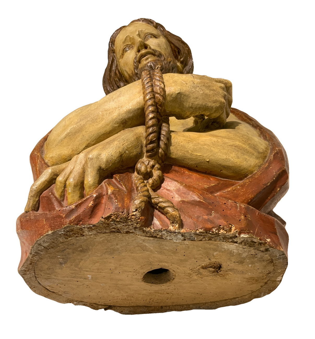 Ecce Homo, scultura lignea policroma a mezzo busto, XV/XVI secolo. H cm 72 H cm 71, base 40,25 cm. Quest'opera resa espr