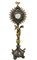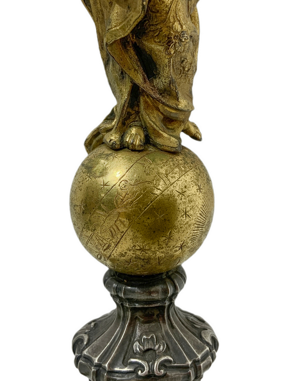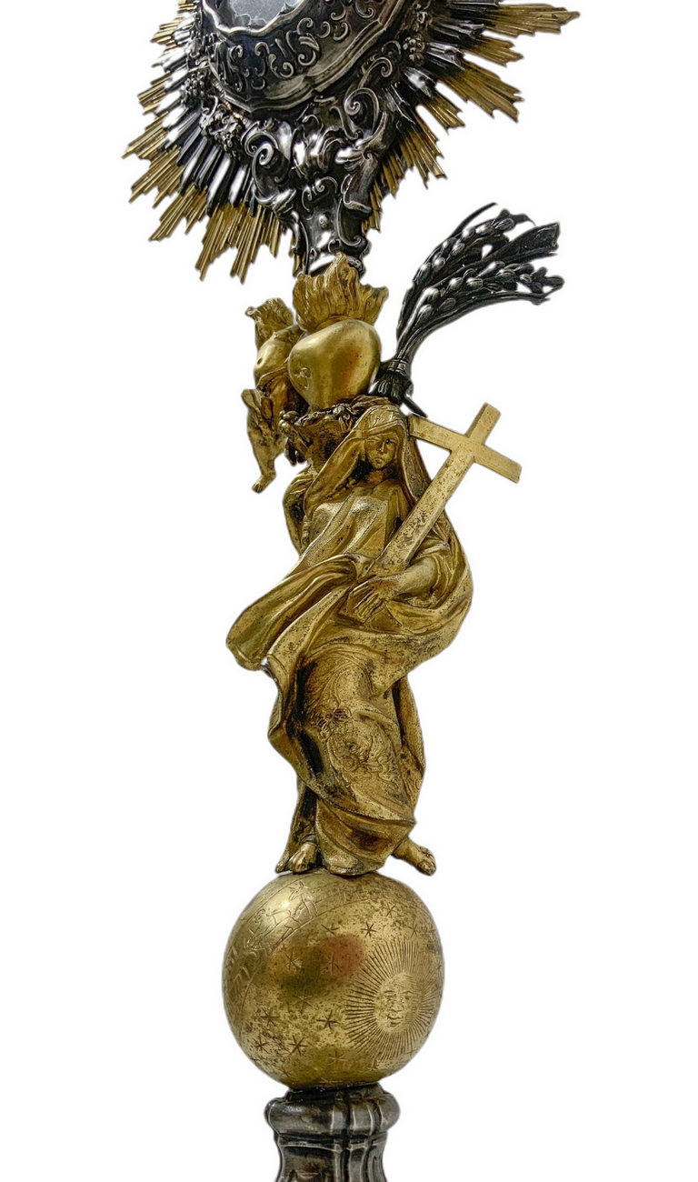 Opera di elegante e raffinata fattura barocca in argento, eseguita a Napoli nel XVII secolo, recante i segni del saggiatore per le parti staccabili ed il punzone con le lettere “NAP” che riguarda il periodo che va dal 1619 al 1680. La base poggia su quattro piedi a riccio con ornati vegetali a fogli d’acanto, un globo in argento dorato inciso con i simboli dell'Universo ed i segni dello zodiaco sostiene una statuina dorata raffigurante la Madonna portatrice della croce del figlio e sostenente un cuore ferito al cui latere vi è un angioletto e, dall'altra parte, tre spighe di grano. Nel cuore fiammeggiante e ferito si innesta un ricettacolo a doppio ordine di raggi decorato con tralci di uva. In testa alla raggiera, la croce apicale.