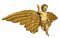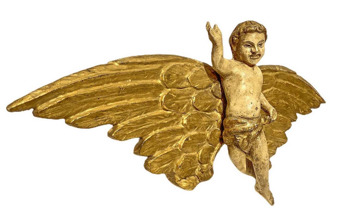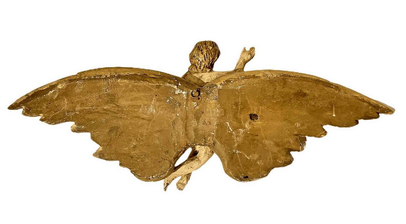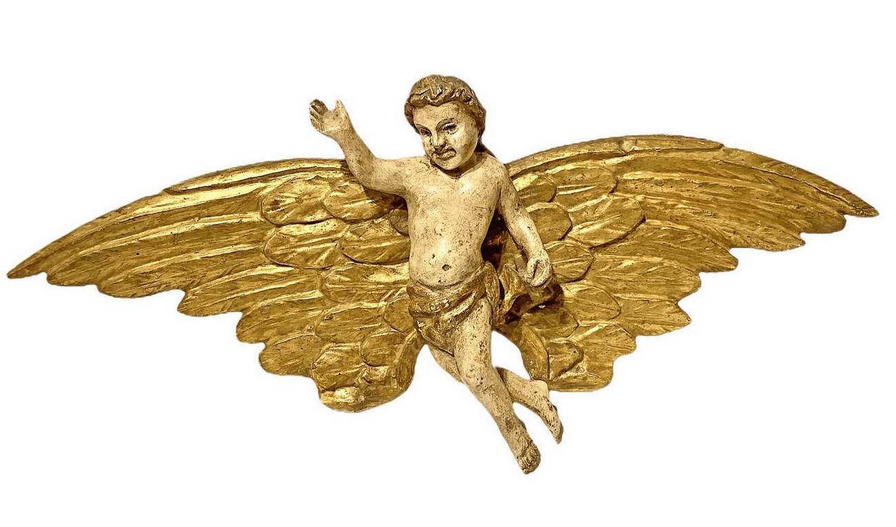 Scultura con angelo policromo in legno laccato e dorato a foglie, XVIII secolo. Cm 32x74