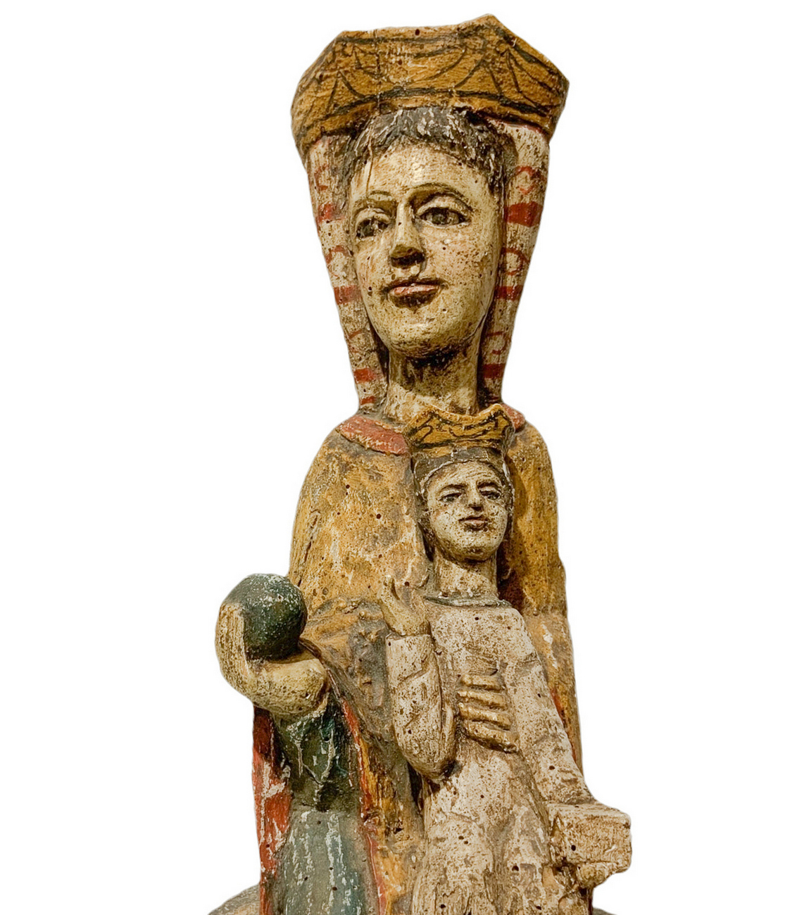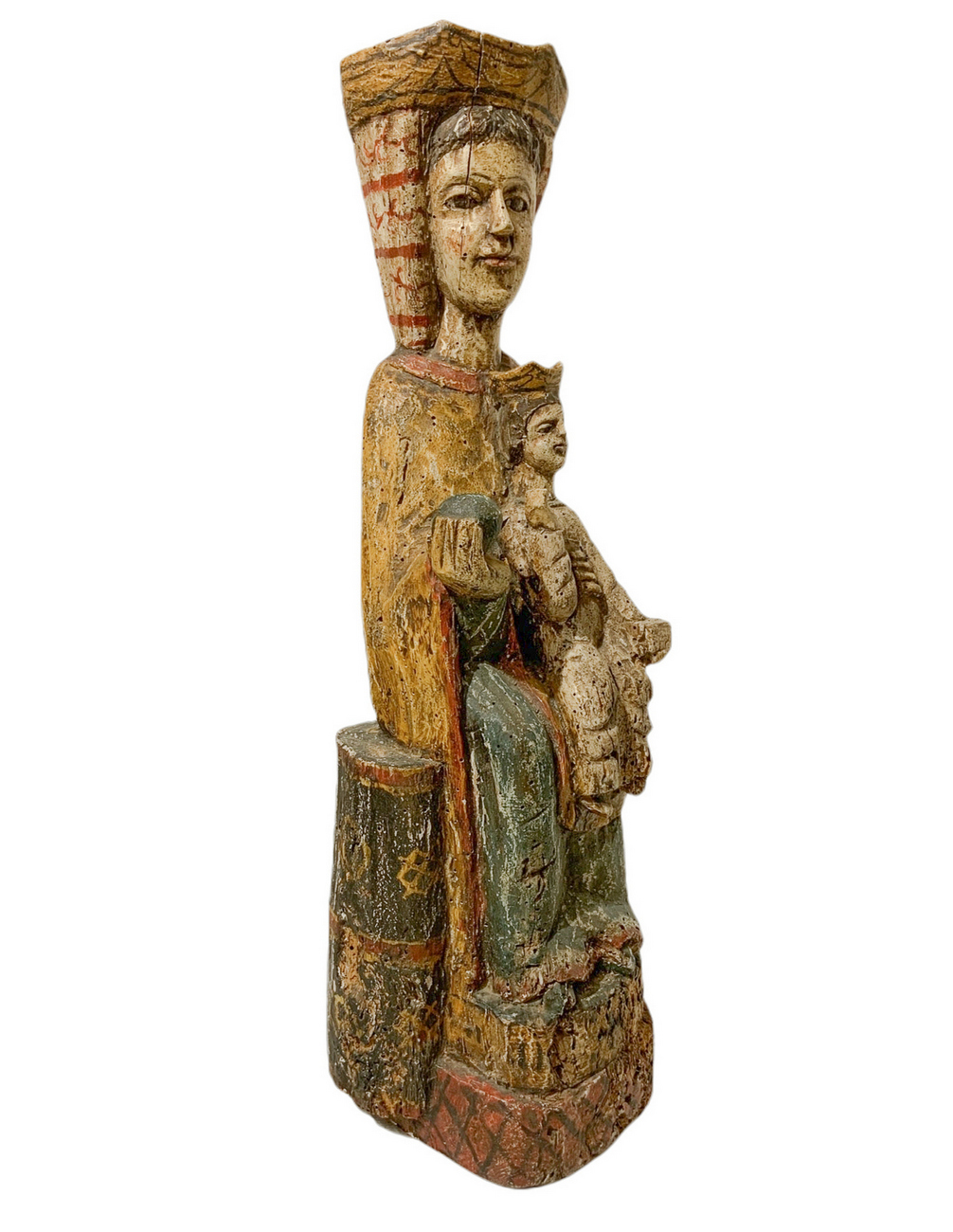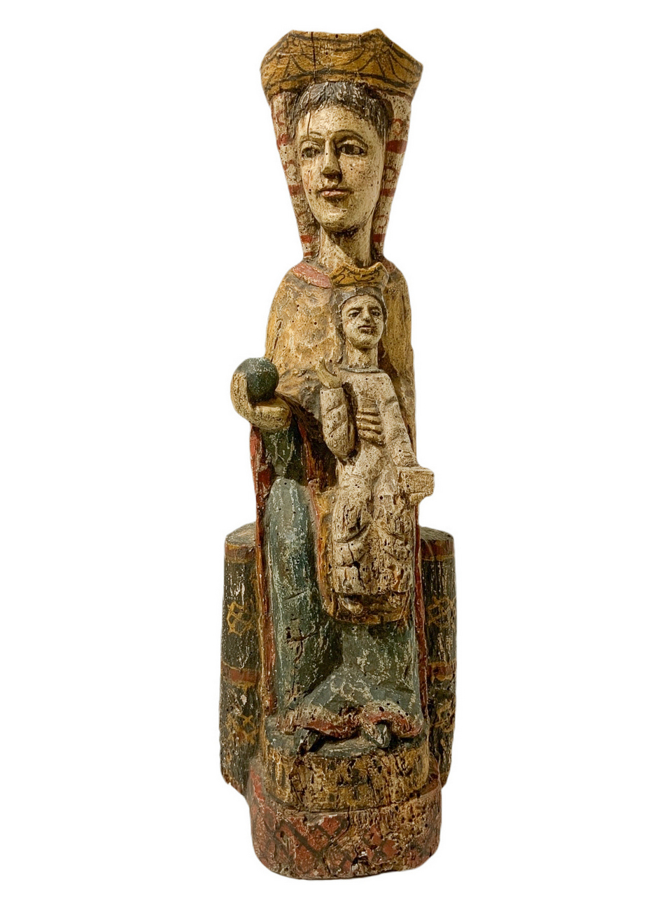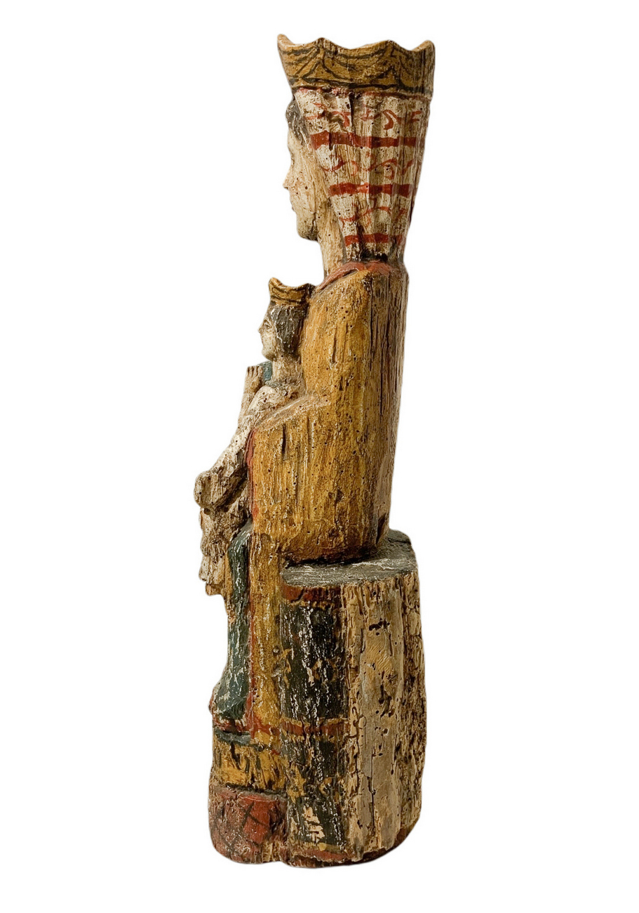 Statua lignea raffigurante Madonna in trono con bambino. H cm 58. Base cm 18