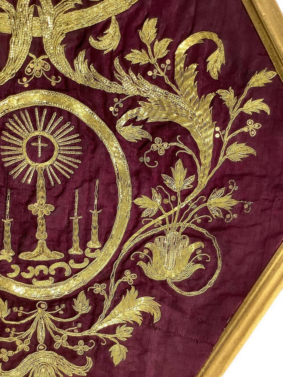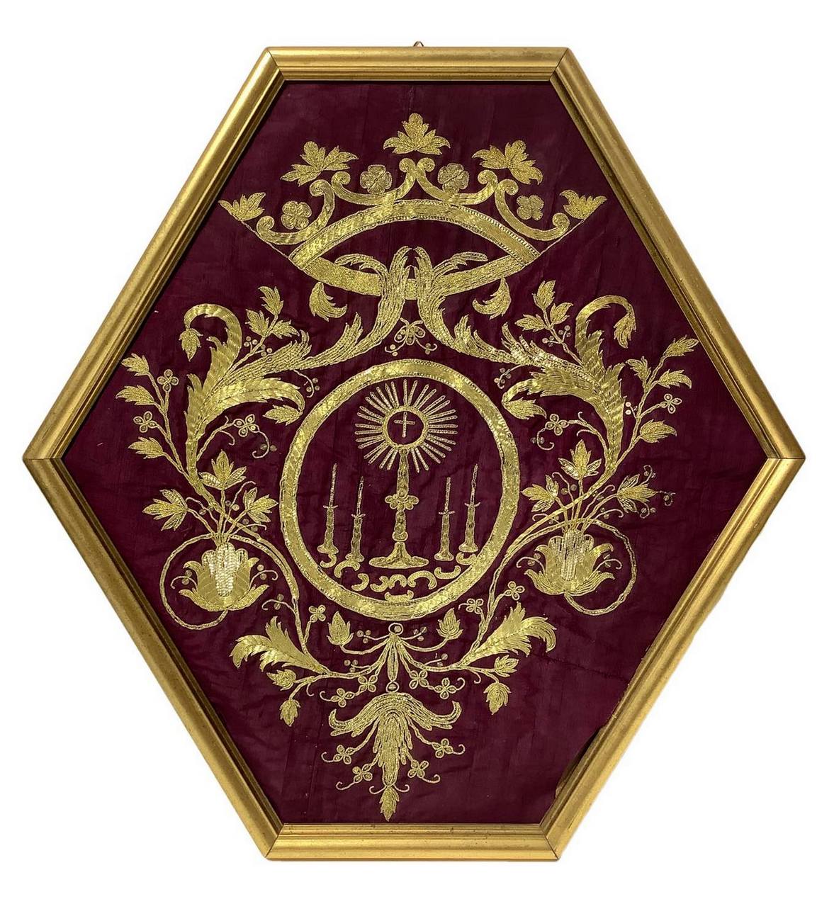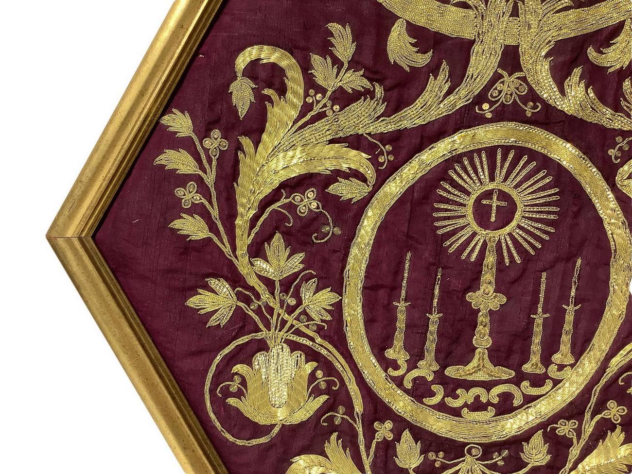 Paramento liturgico ricamato in oro zecchino con decoro floreale a larghe foglie in cornice esagonale. Cm 55x50