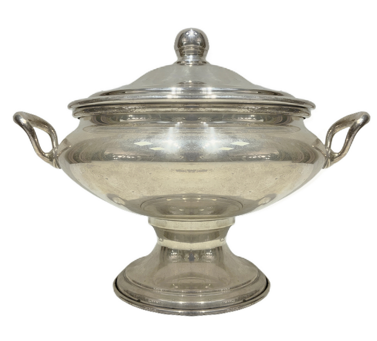 Zuppiera in argento con manici. Peso kg 1,614. H cm 27. Larghezza cm 35