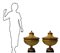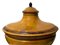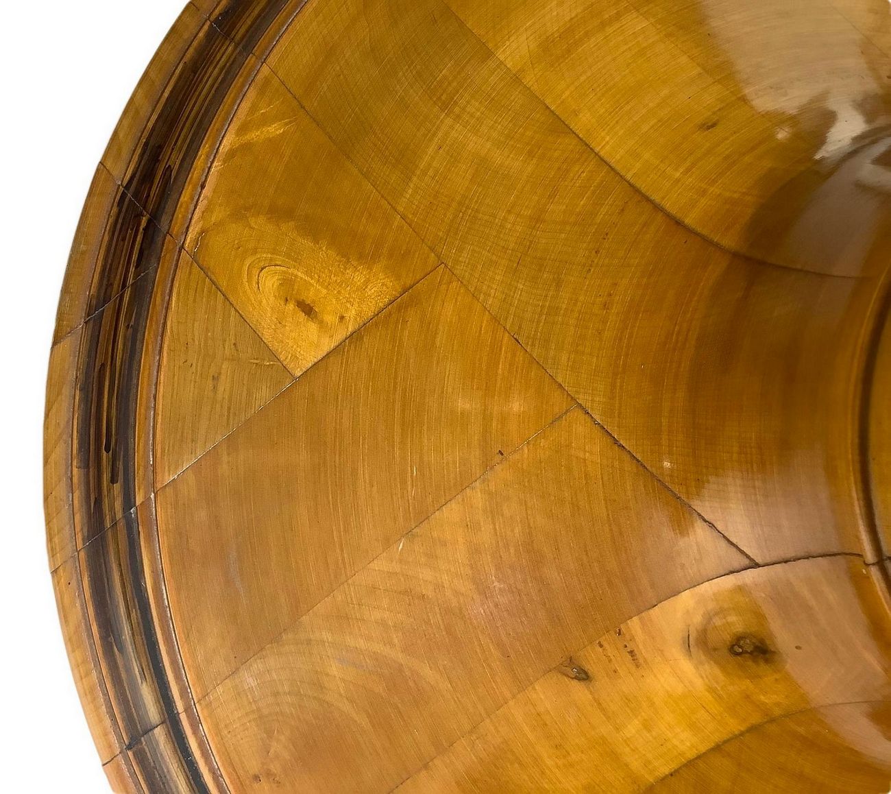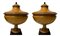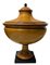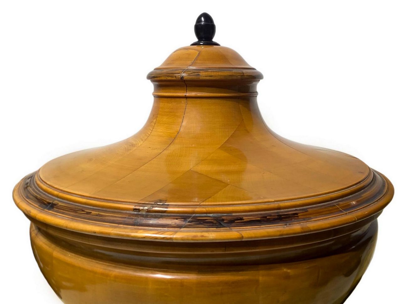 Coppia di potiche Biedermeier in legni chiari con dettagli, pomo e base ebanizzati. Con coperchio h 62X50.