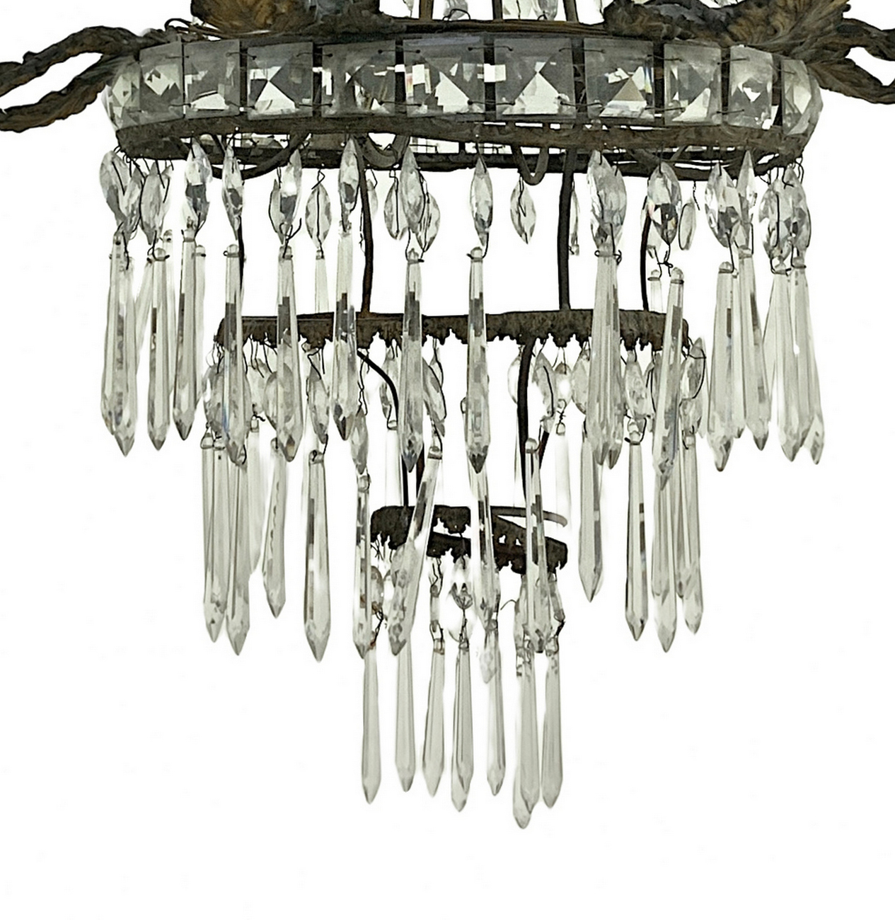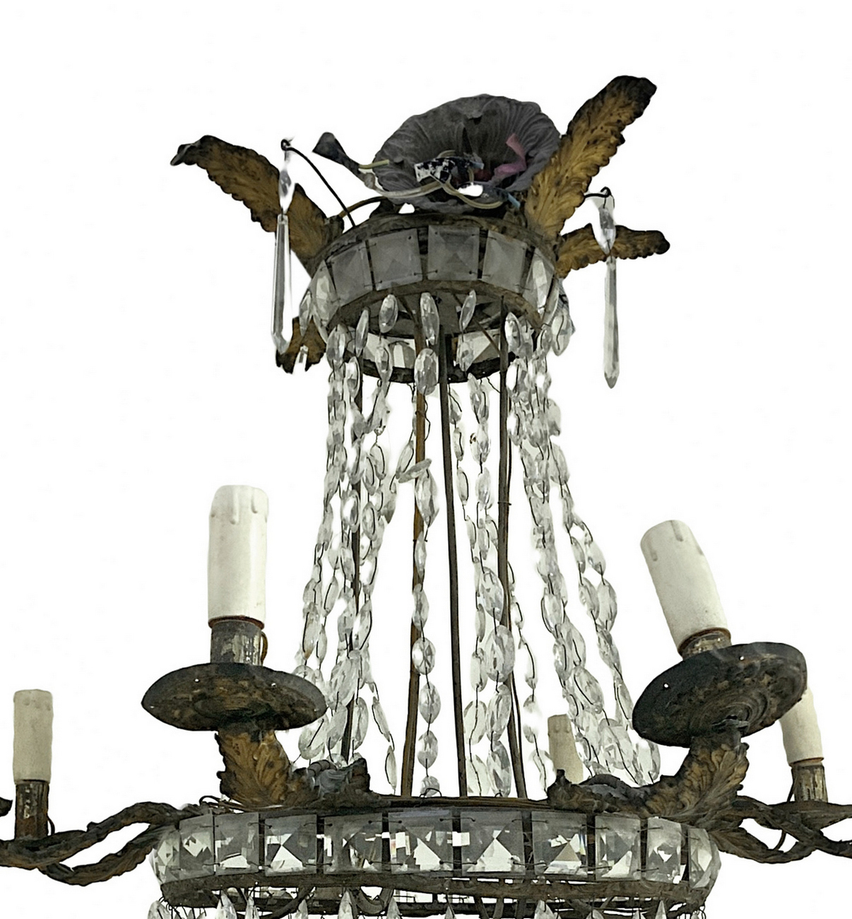 Lotto 89 | Lampadario a ninfa con foglie in ottone leggero (carta di Spagna sbalzata), otto luci con vetri molati a mano coevi. XVI