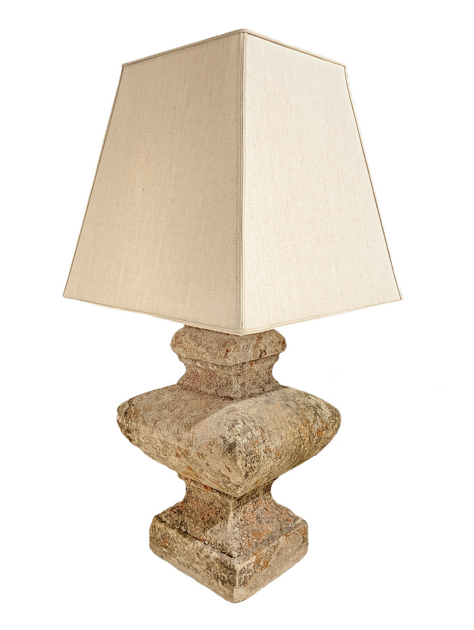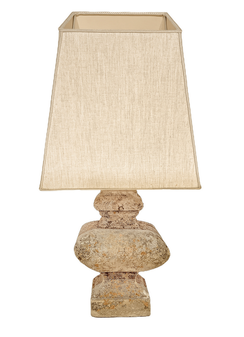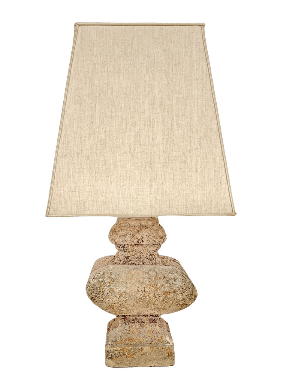 Lotto 93 | Lampada con paralume tronco conico, base a balaustra in pietra bianca, XVII secolo.n H totale cm 75, H balaustra cm 40.