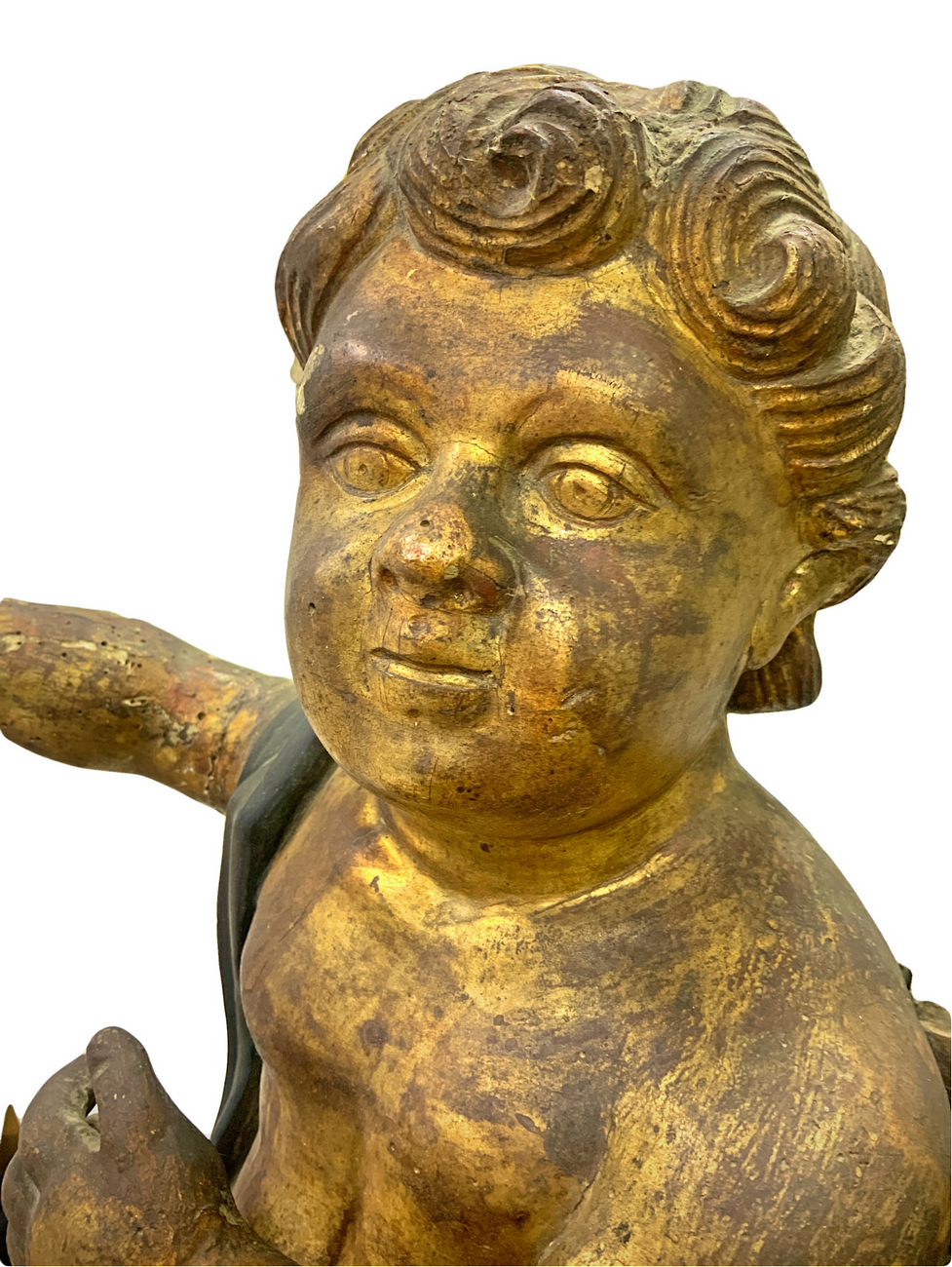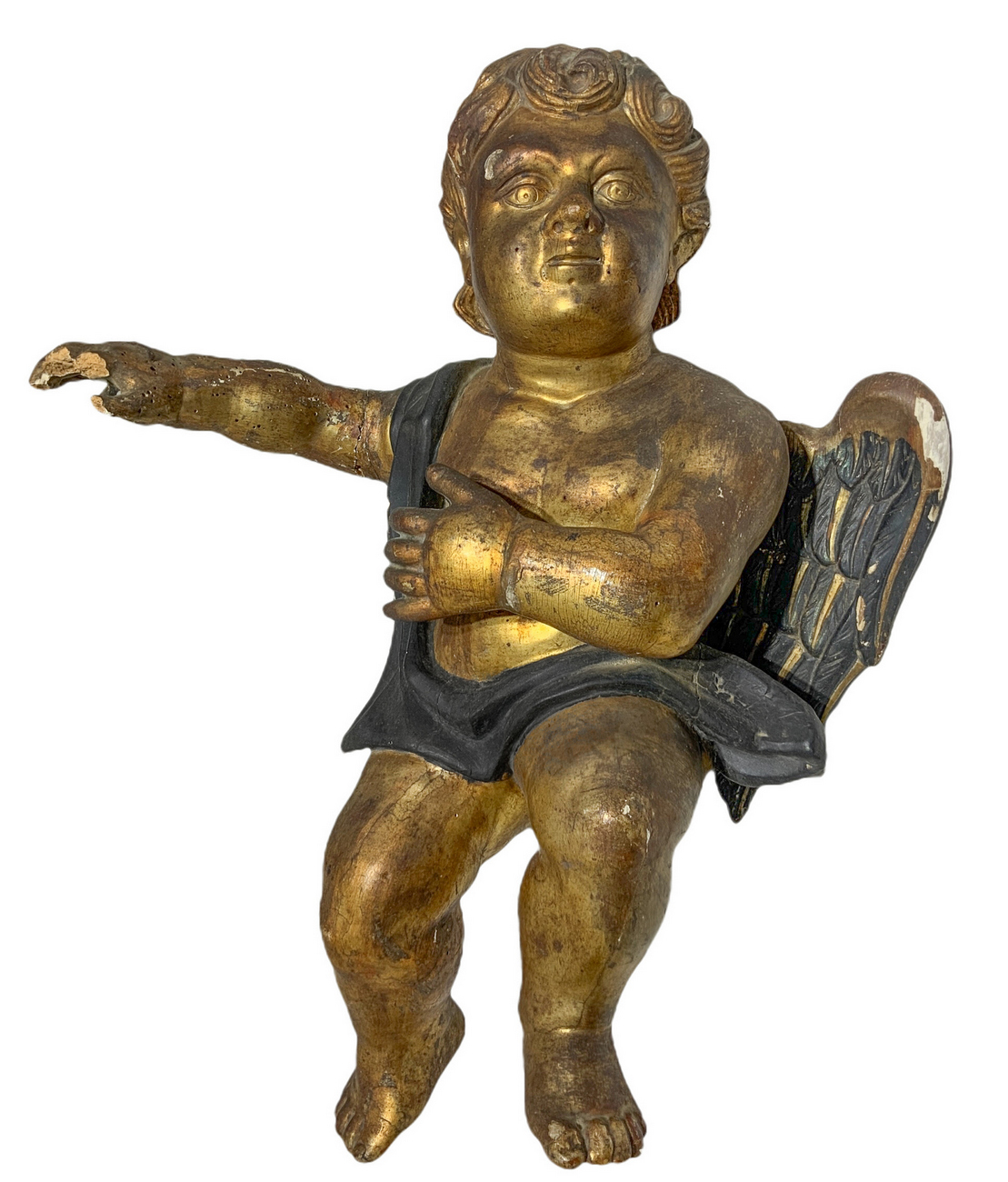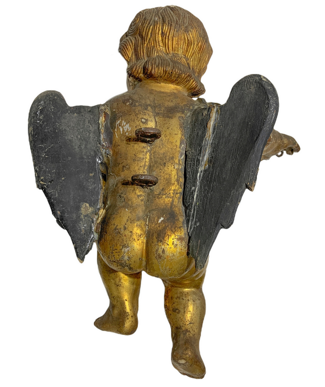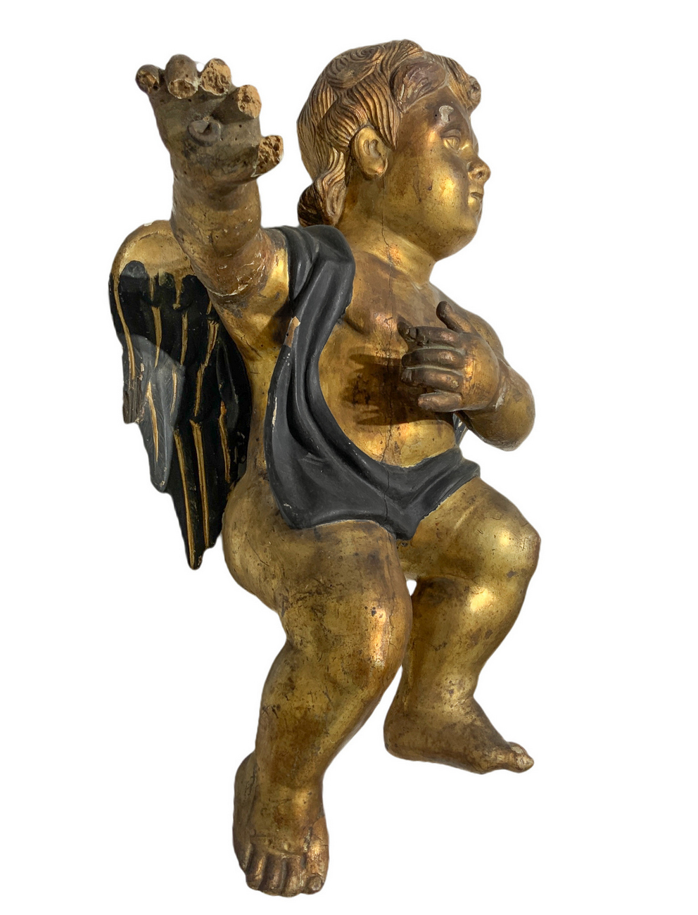 Angelo in legno dorato e laccato, XVII secolo. H cm 55, presenti mancanze.