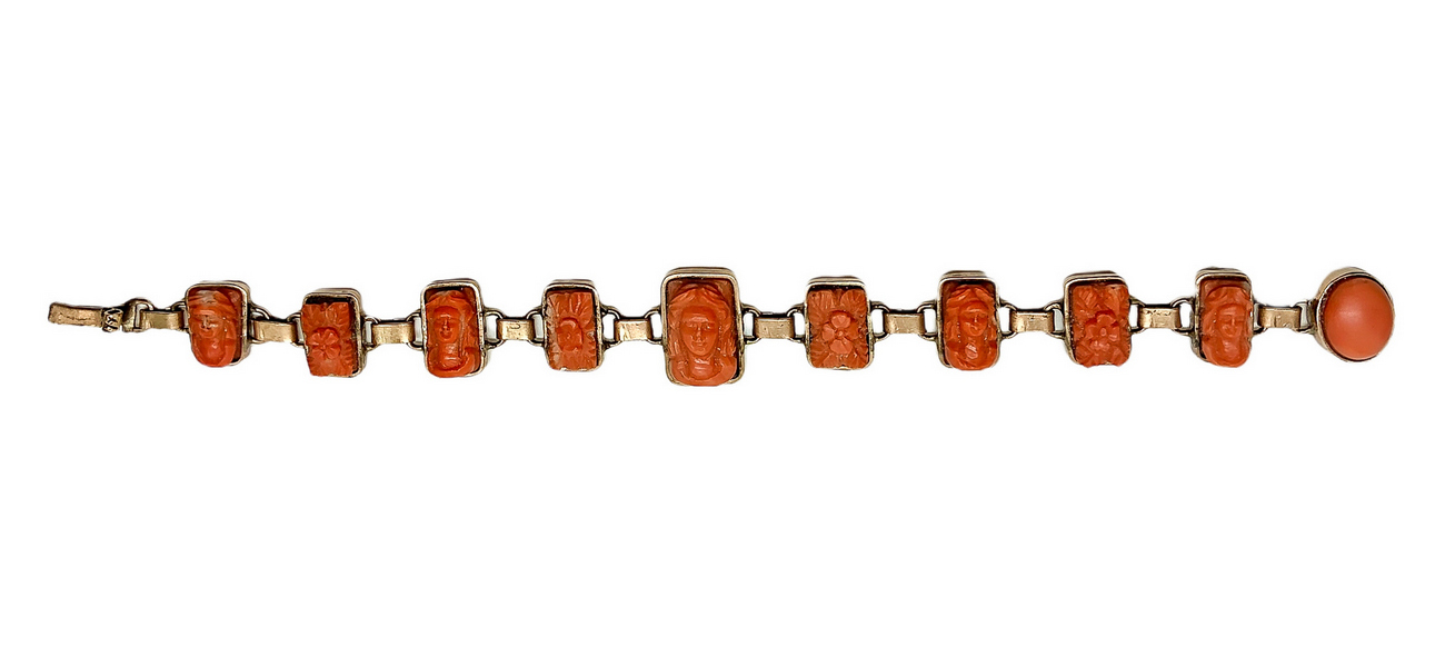 Bracciale in corallo di Sciacca, con 11 miniature raffiguranti volti e decorazioni floreali. Lunghezza complessiva cm 19,5
