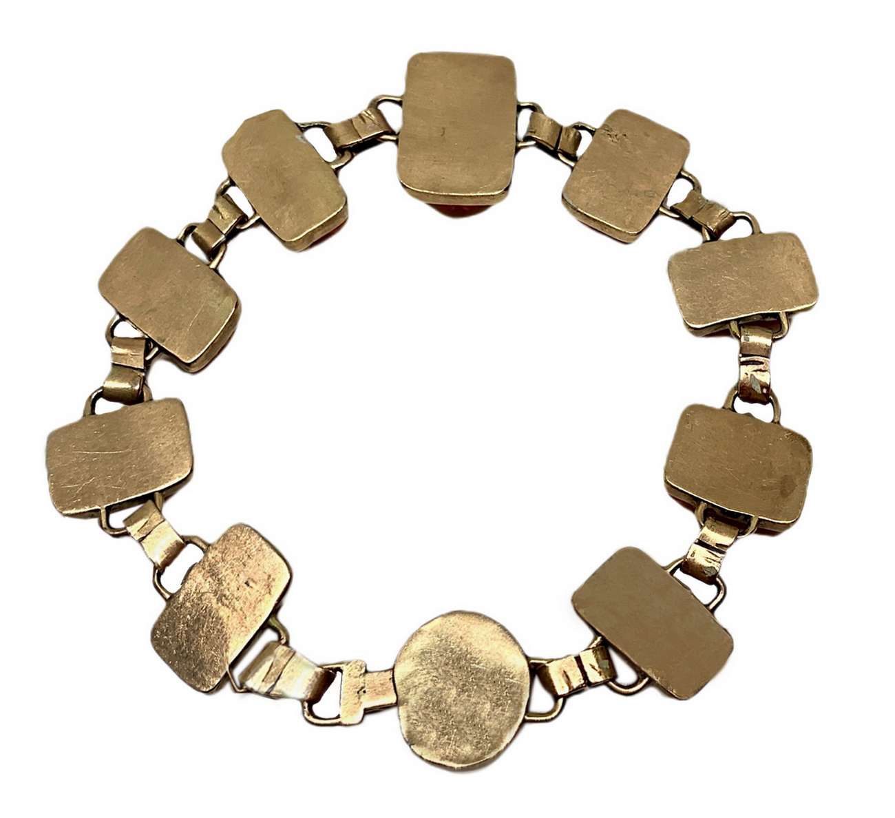 Bracciale in corallo di Sciacca, con 11 miniature raffiguranti volti e decorazioni floreali. Lunghezza complessiva cm 1