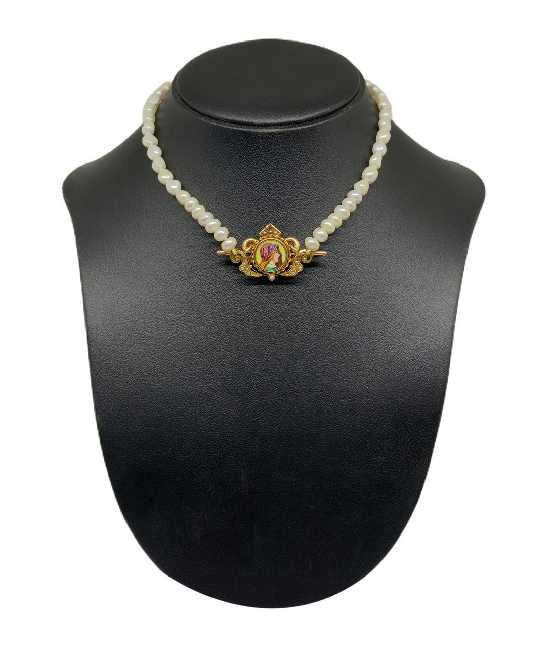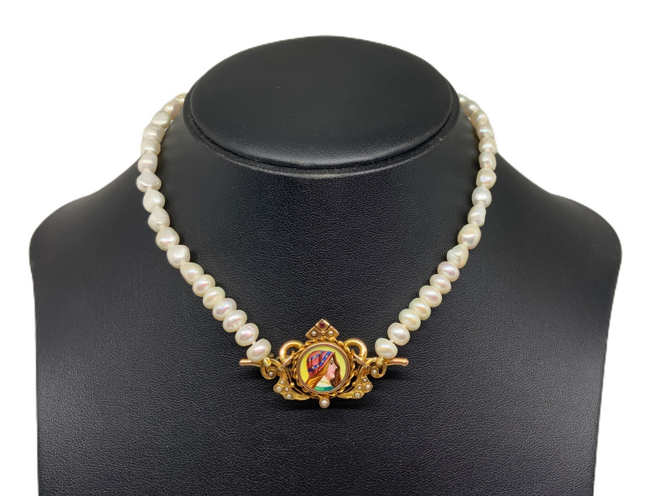 Lotto 109 | Collana perle di fiume spilla centrale in oro antico con figura di donna su smalto