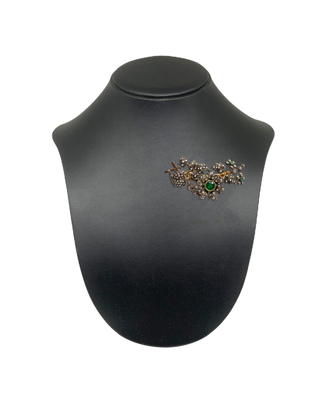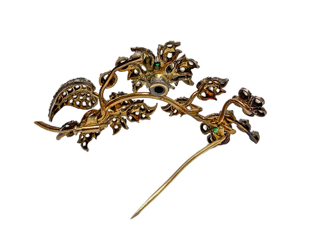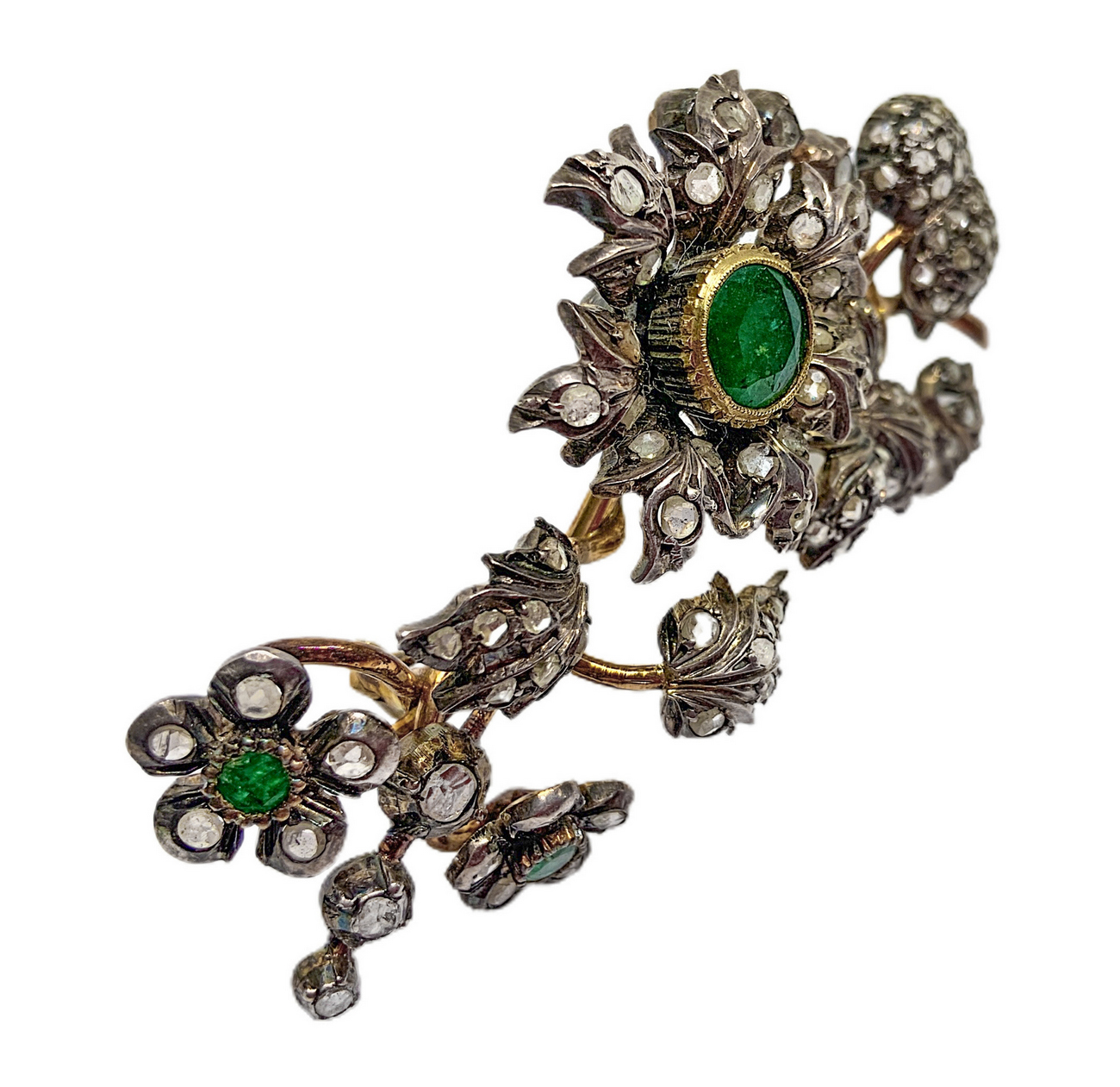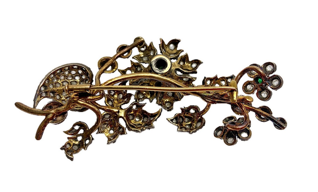 Spilla tralcio di fiori e foglie in oro e argento con 1 radice di smeraldo centrale e 2 laterali, e rosette coronè e rosette di diamanti mis. Cm 8