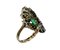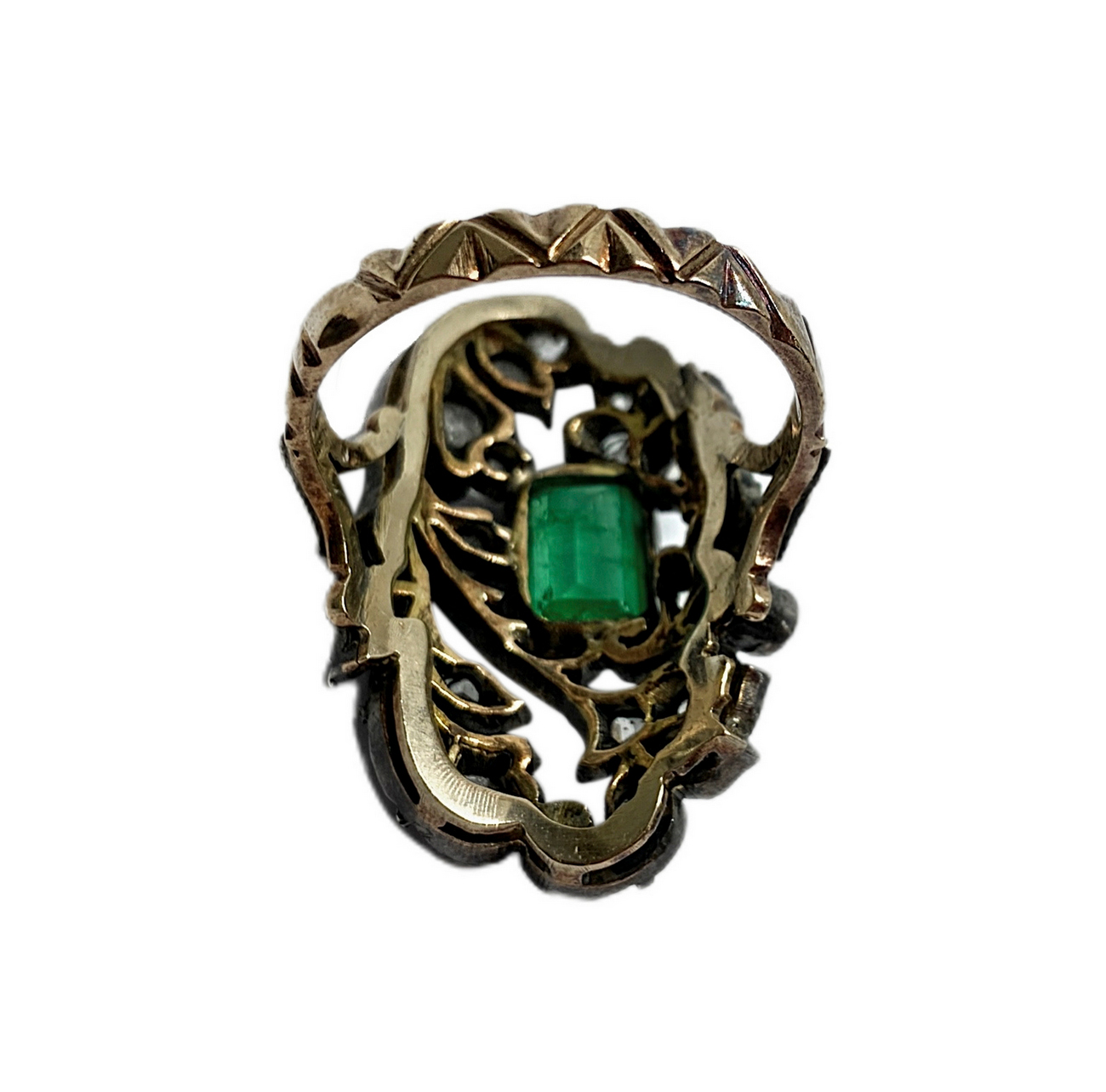 Lotto 118 | Anello in oro e argento con radice di smeraldo rettangolare in centro e rosette di diamanti. Mis. cm 2,50