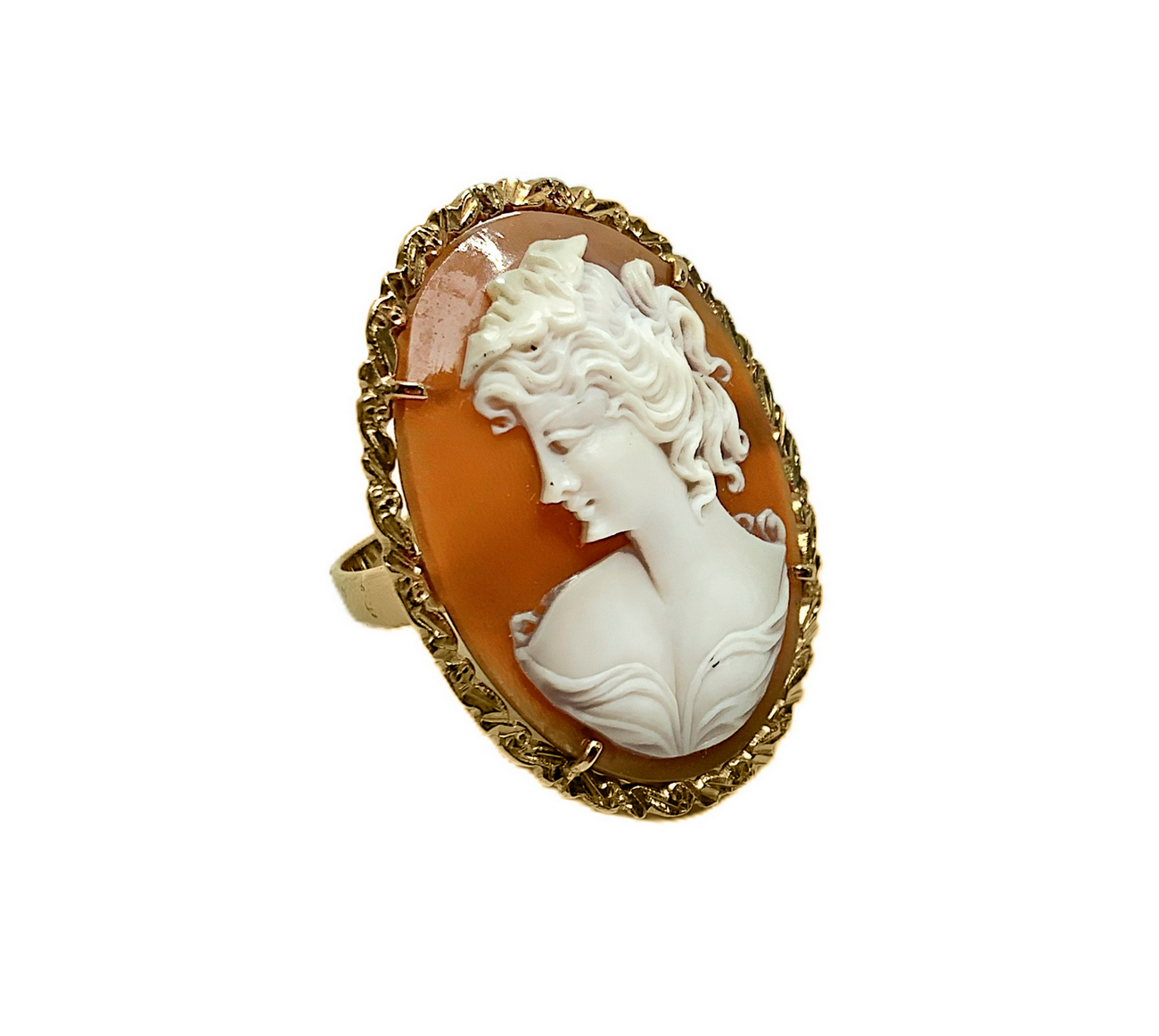 Anello in oro con cammeo ovale fondo scuro figura viso donna cm 3,30