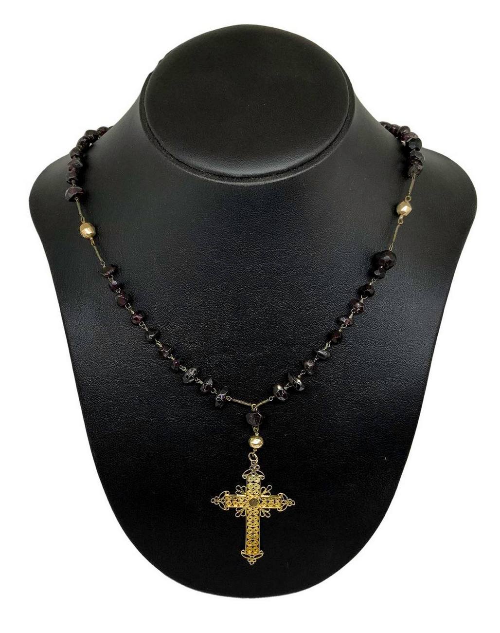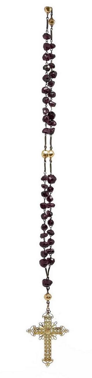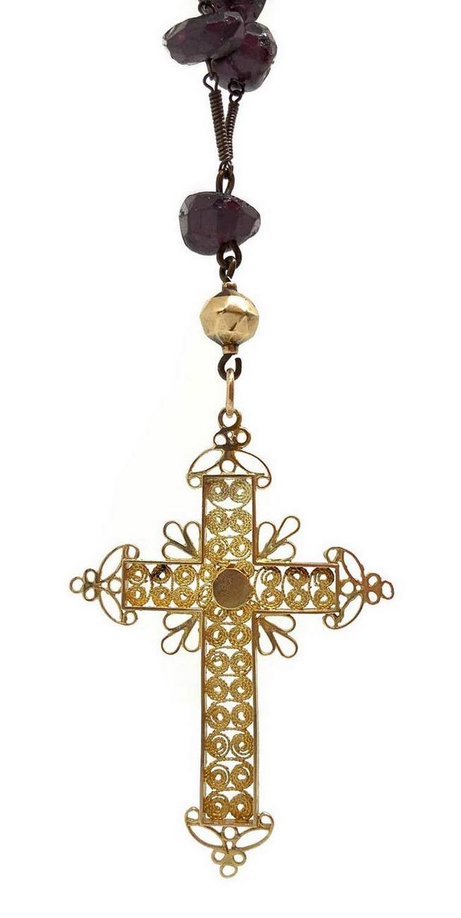 Lotto 134 | Coroncina da rosario in oro 9K e granati, croce in filigrana oro 9 K. Totali gr 44,40, croce gr 4