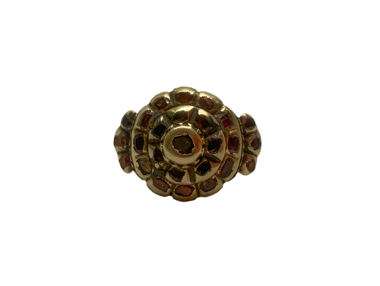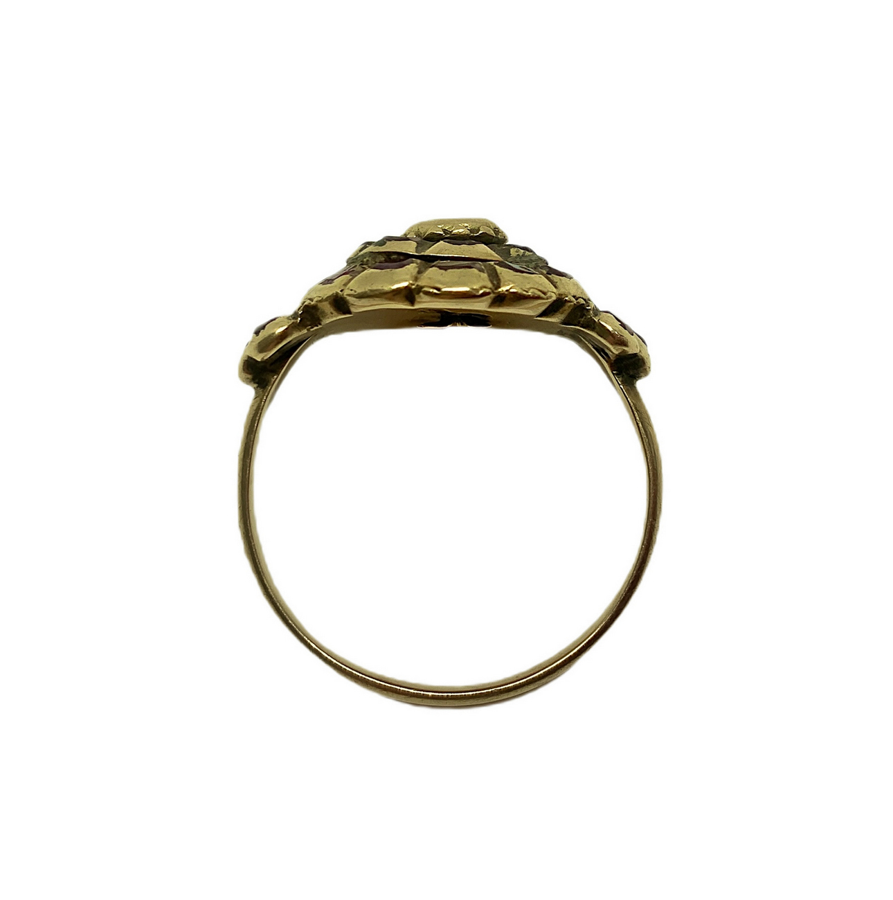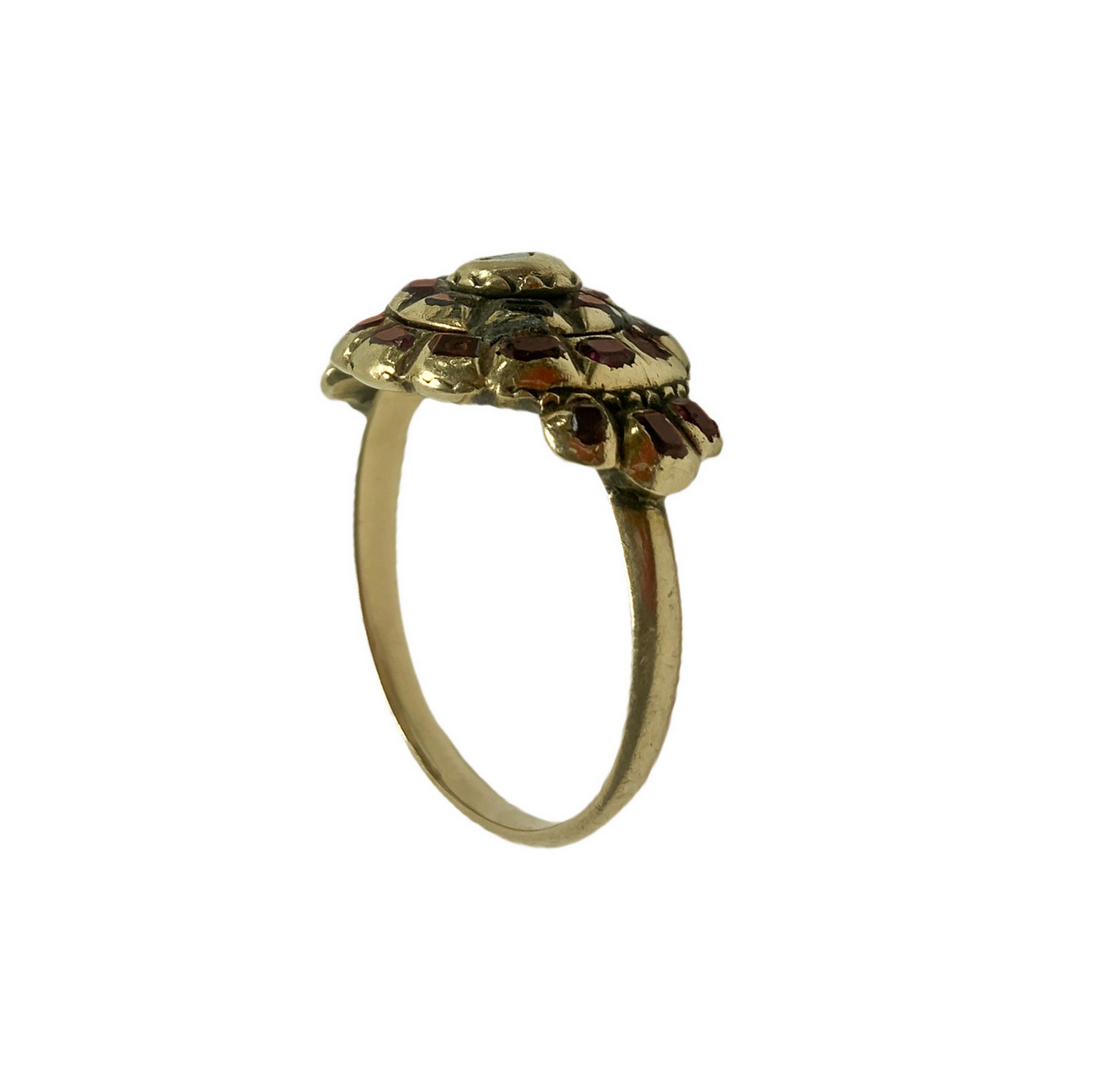 Anello basso titolo con rosetta con scagliette di rubini (mancante di una)