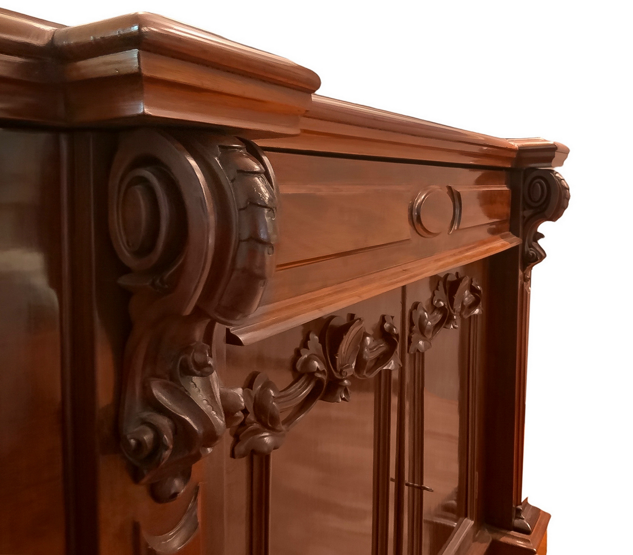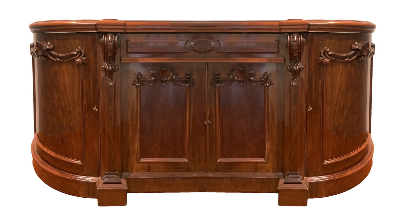 Credenza bassa in legno di mogano con interni foderati, cassetto centrale superiore più due sportelli angolari e due centrali. Intagli di legno a ghirlanda applicati. H cm 98, lunghezza cm 210, profondità cm 66