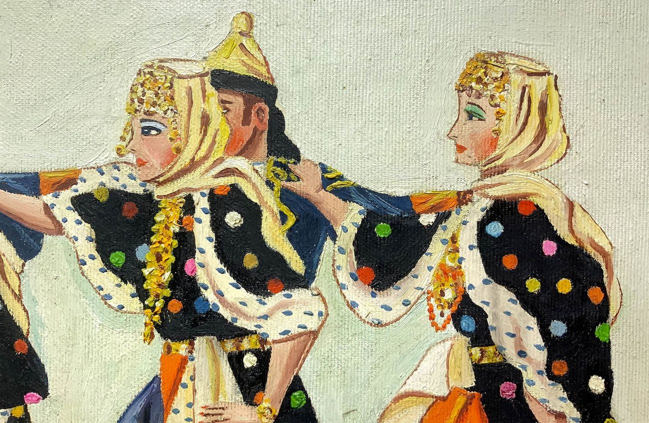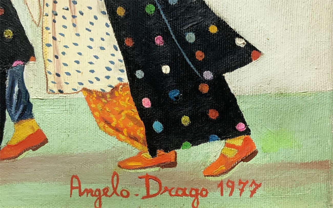 Dipinto ad olio su tela raff. Personaggi orientali, Drago Angelo (Ct 1930/Ct 2020), cm 60x50. Firmato e datato in alto a sinistra 1977