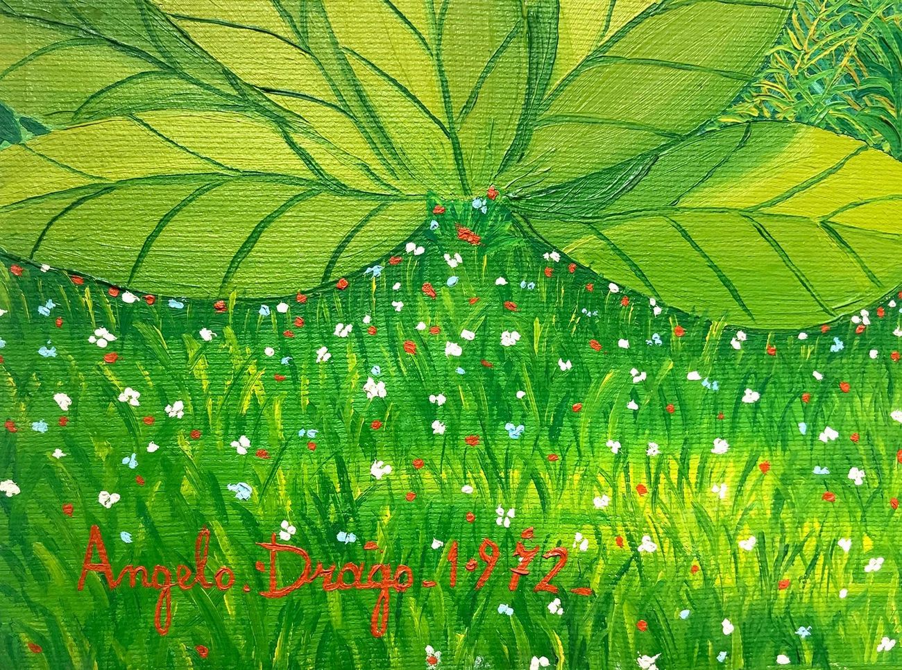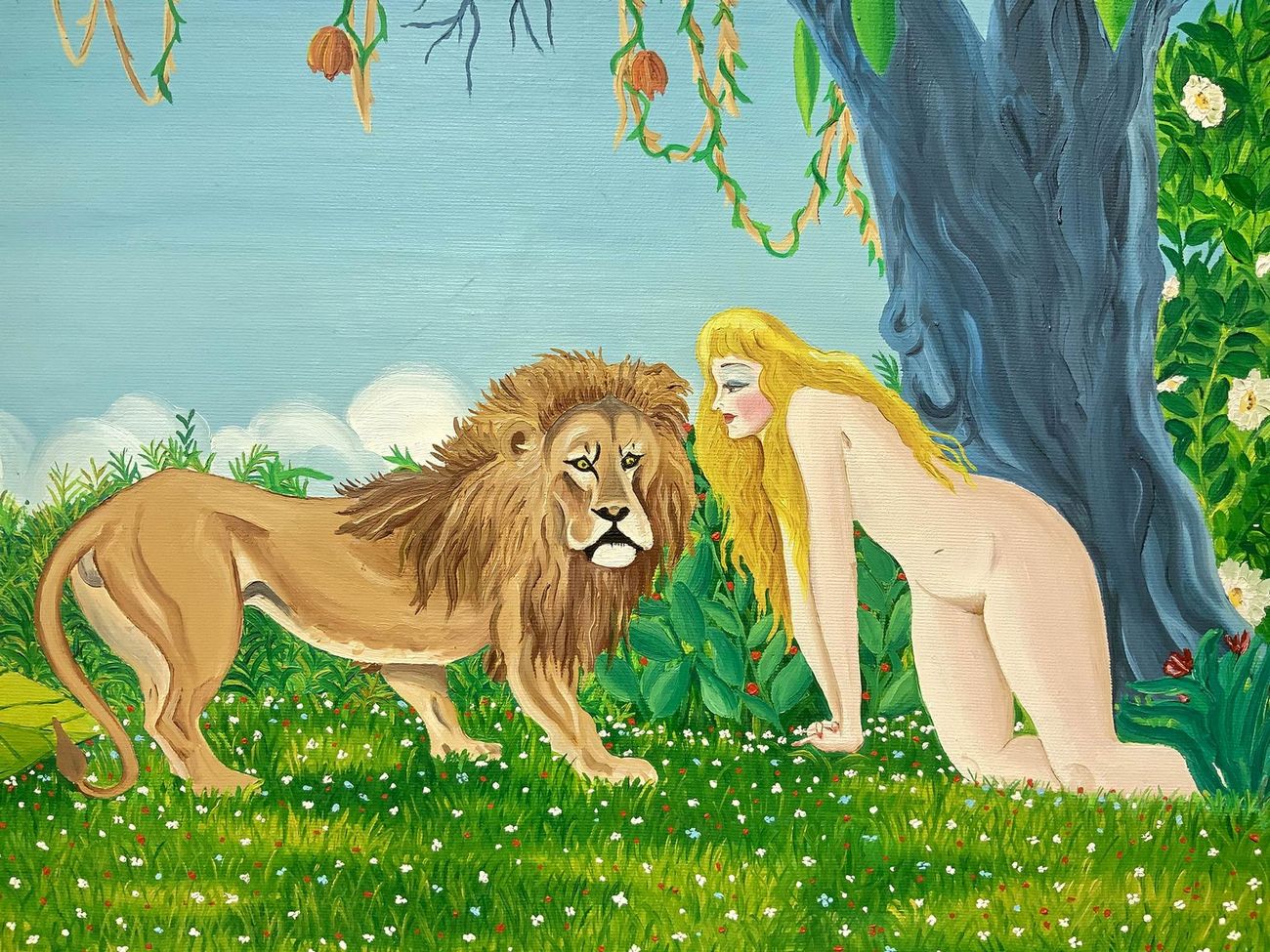 Dipinto ad olio su tela raff. Scena esotica di nudo di donna con leone, Drago Angelo (Ct 1930/Ct 2020), cm 50x70, firmato e datato in basso a sinistra 1972