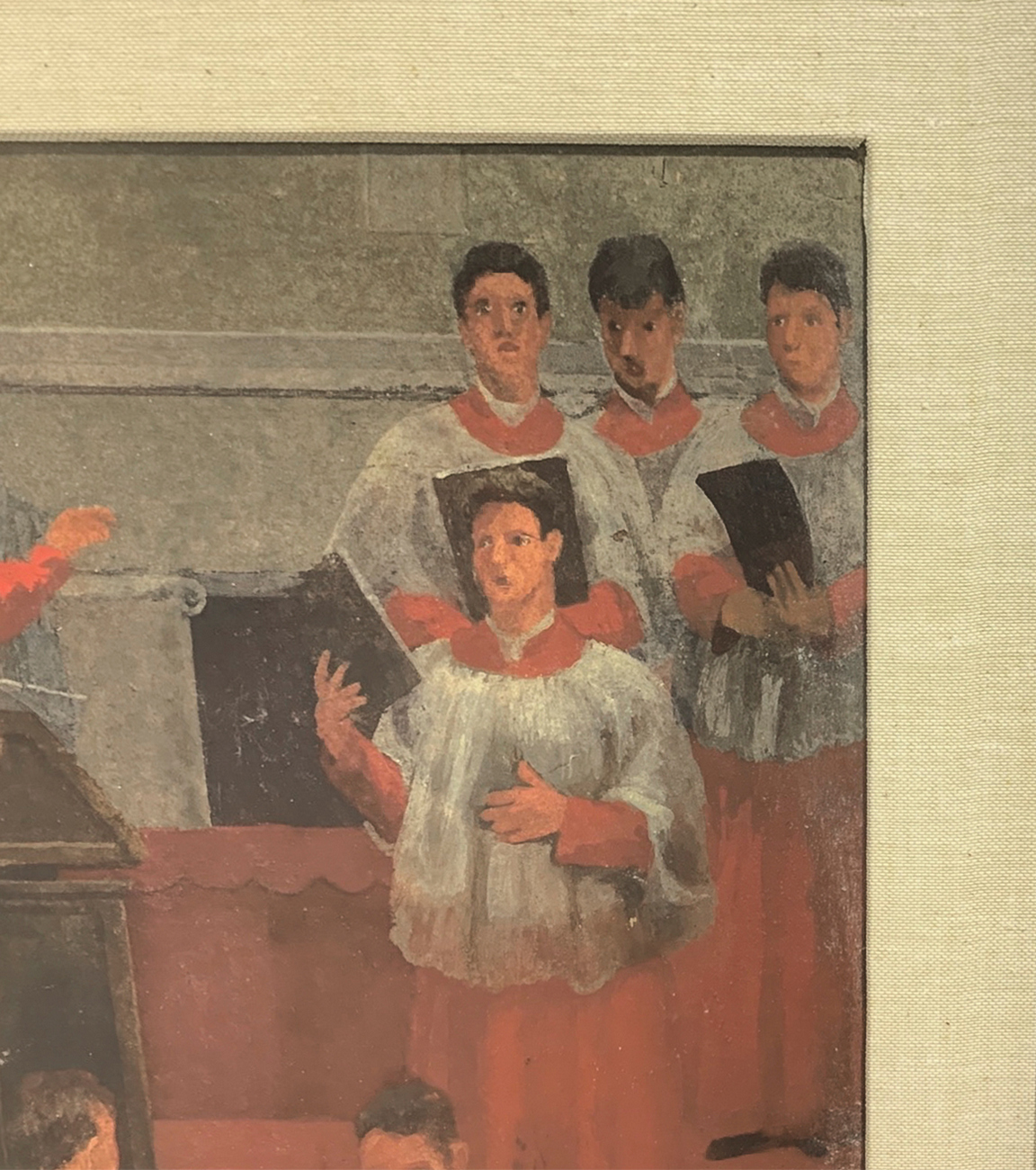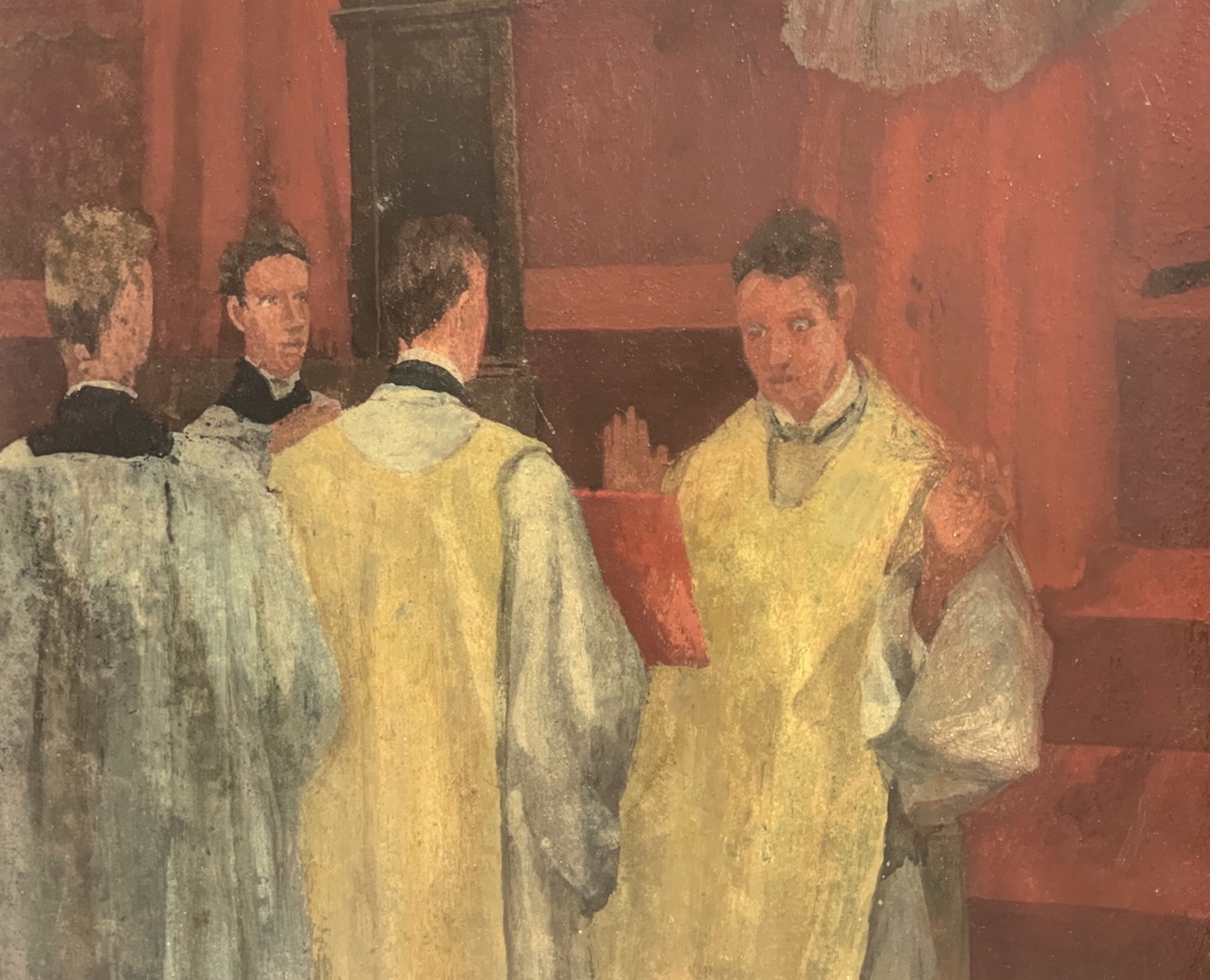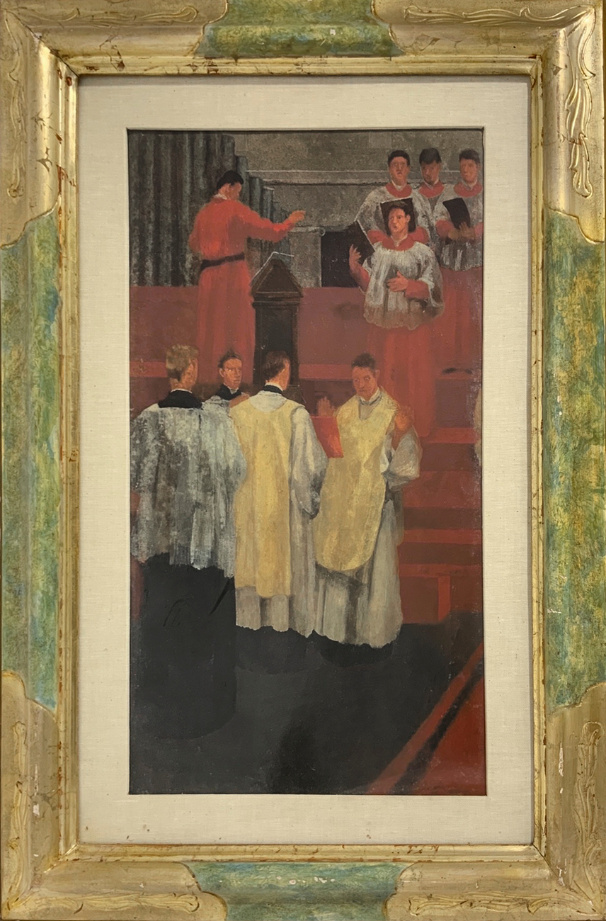 Guglielmo Janni (Roma, 19 novembre 1892 - Roma, 23 gennaio 1958), dipinto ad olio su cartone pressato raffigurante sacerdoti in preparazione liturgica. Firmato in basso a destra Guglielmo Janni ( - ) e datato sul retro 1937. Cm 33x59,5, in cornice cm 80x53
