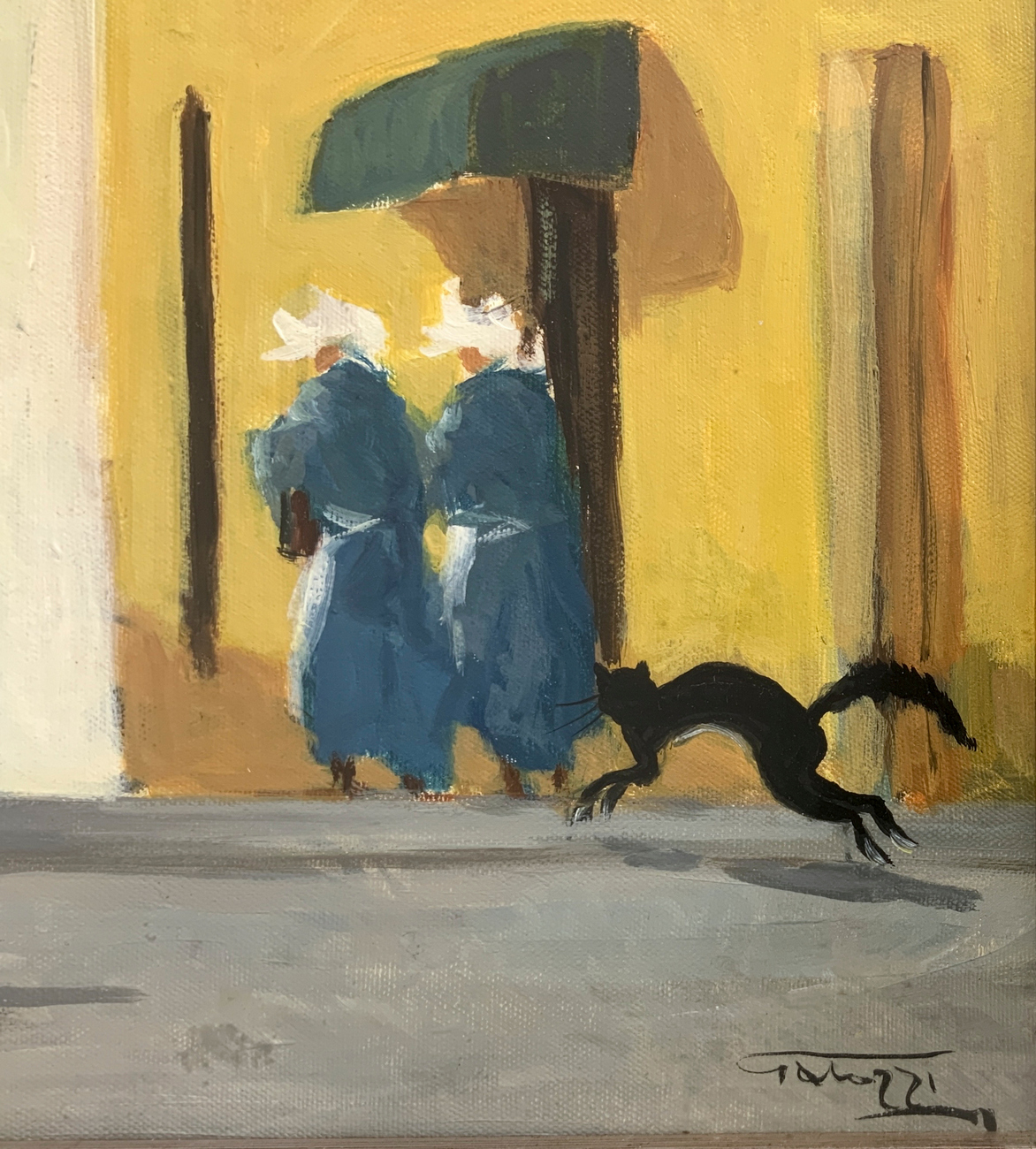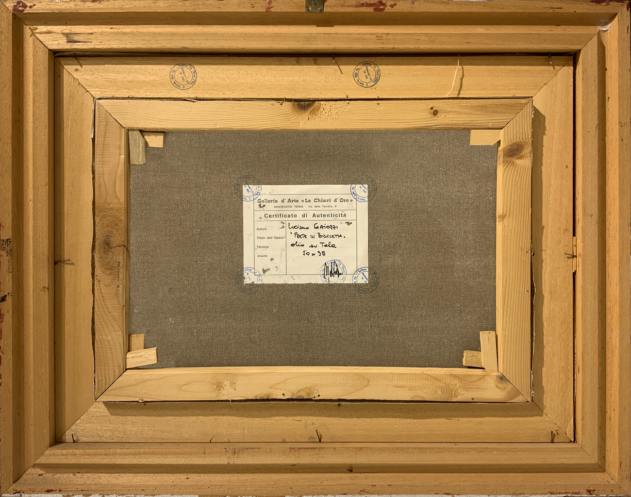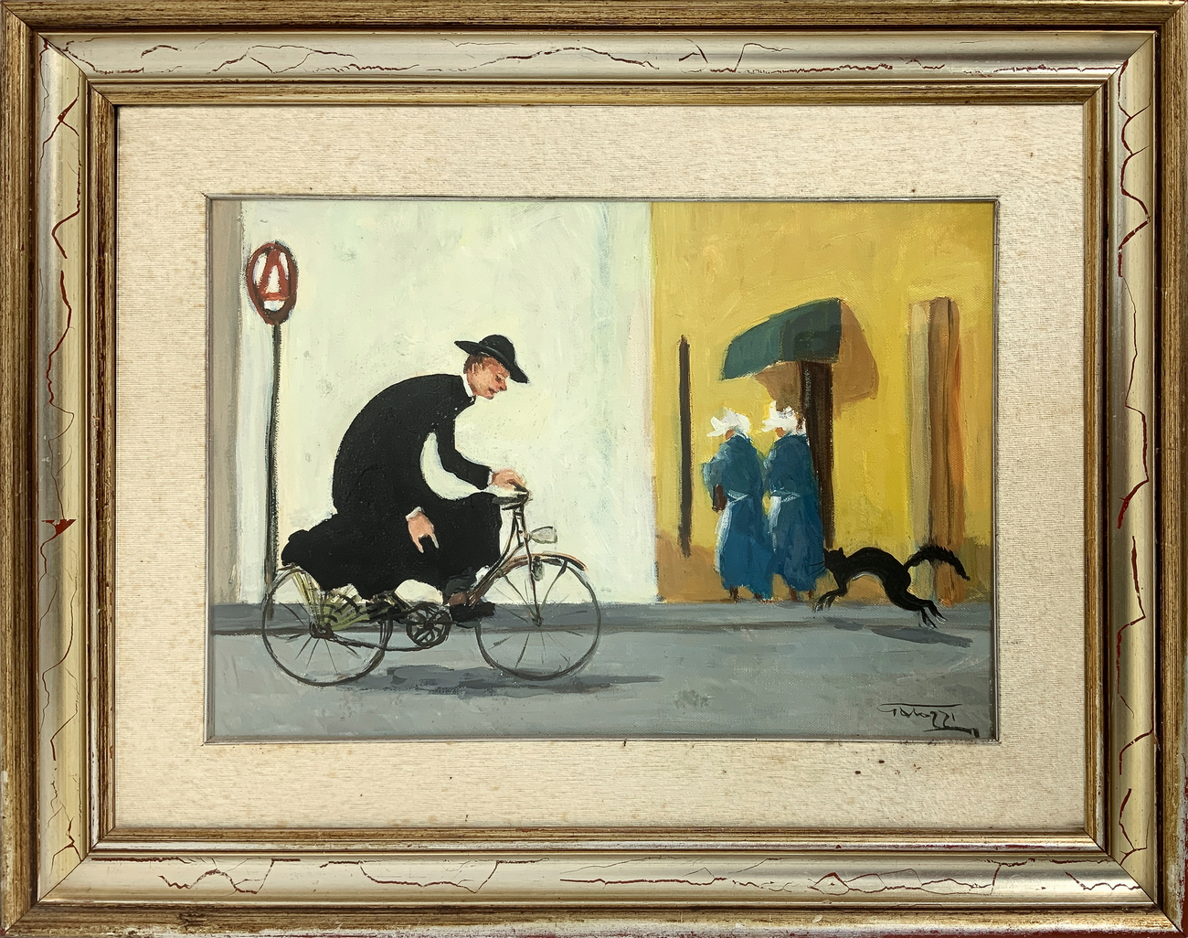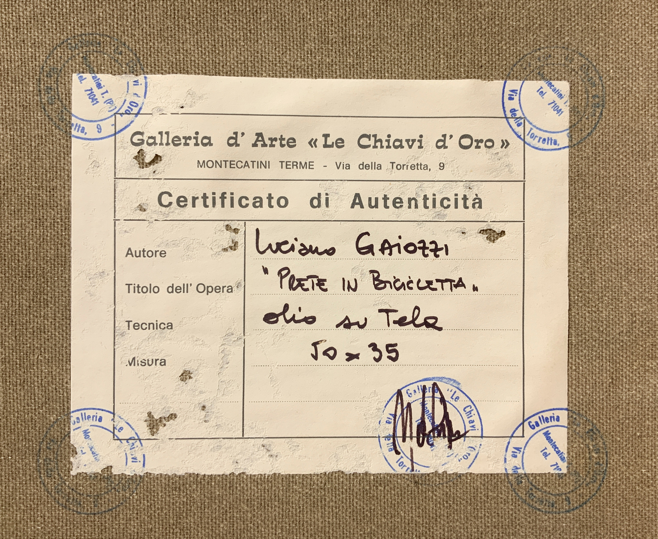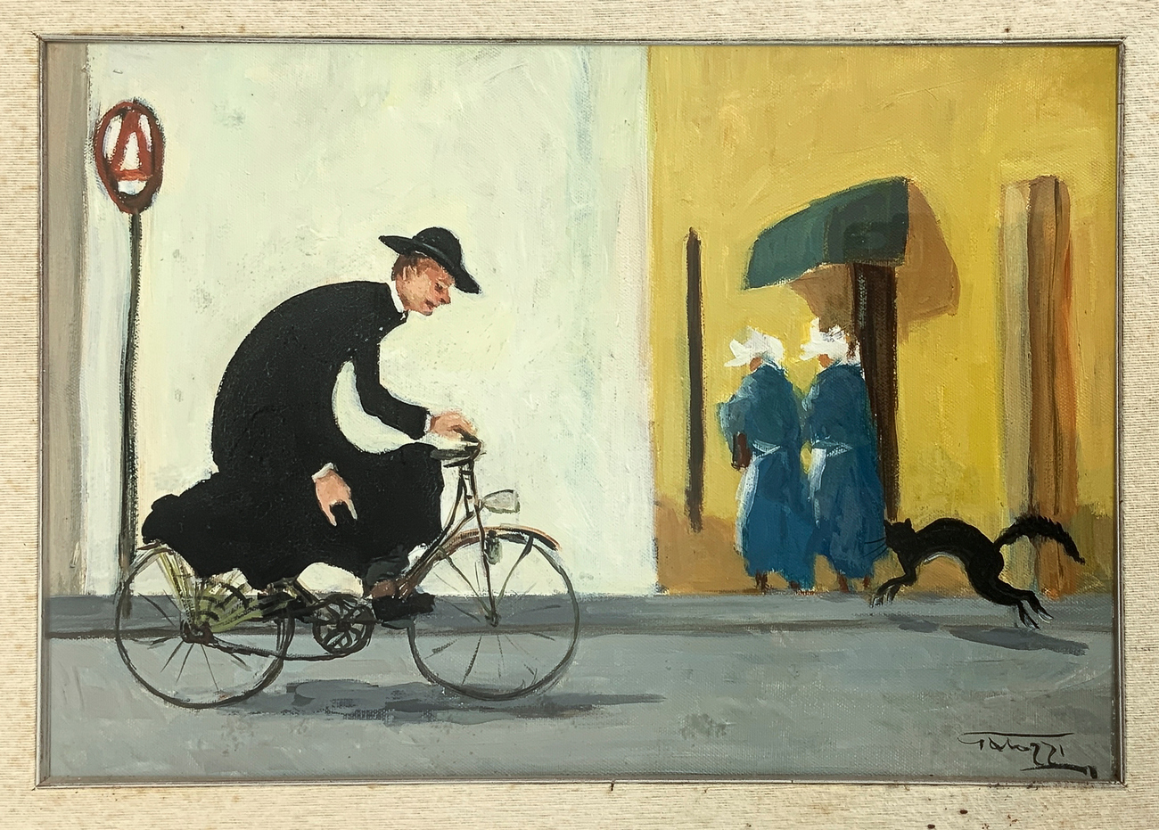 Dipinto ad olio su tela raffigurante prete in bicicletta, firmato Luciano Gaiozzi (1934-1996). Cm 35x50. In cornice cm 57x72 200