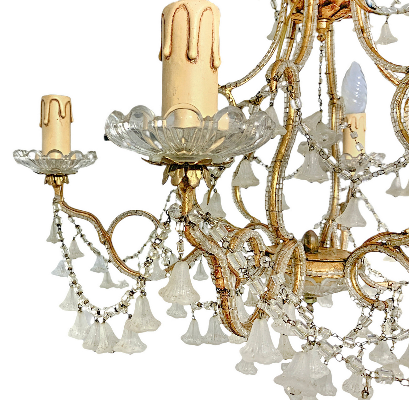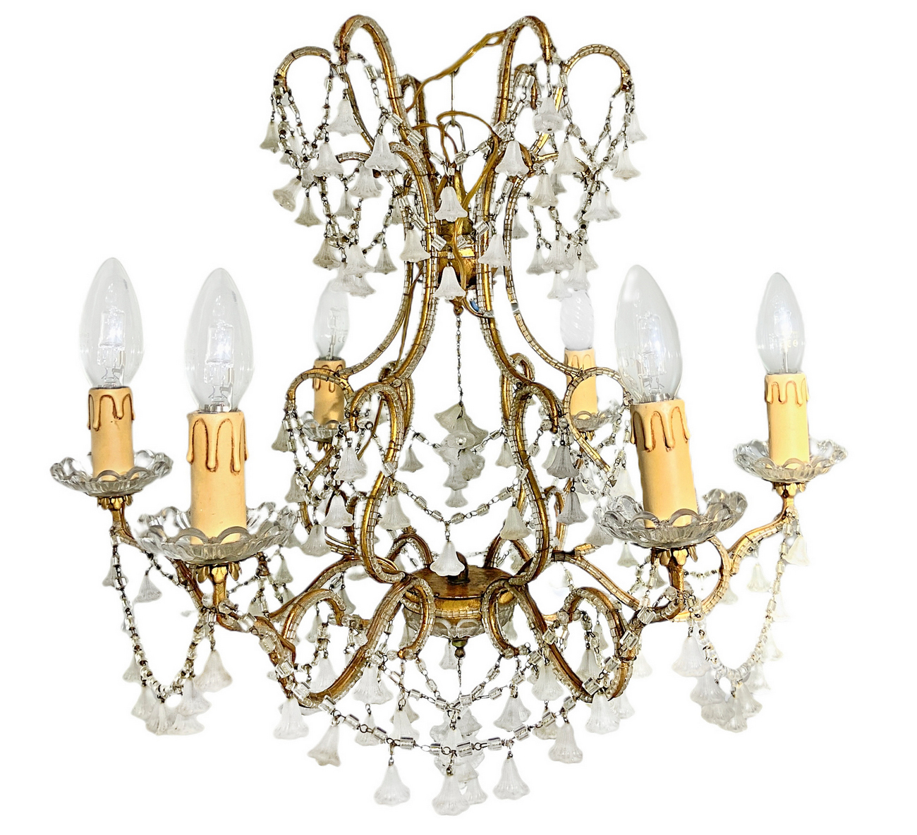 Lampadario a 6 luci in metallo con brindoli e piattini in vetro, inizi XX secolo. H cm 50, diametro cm 60