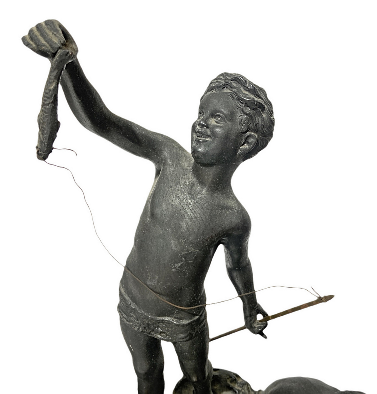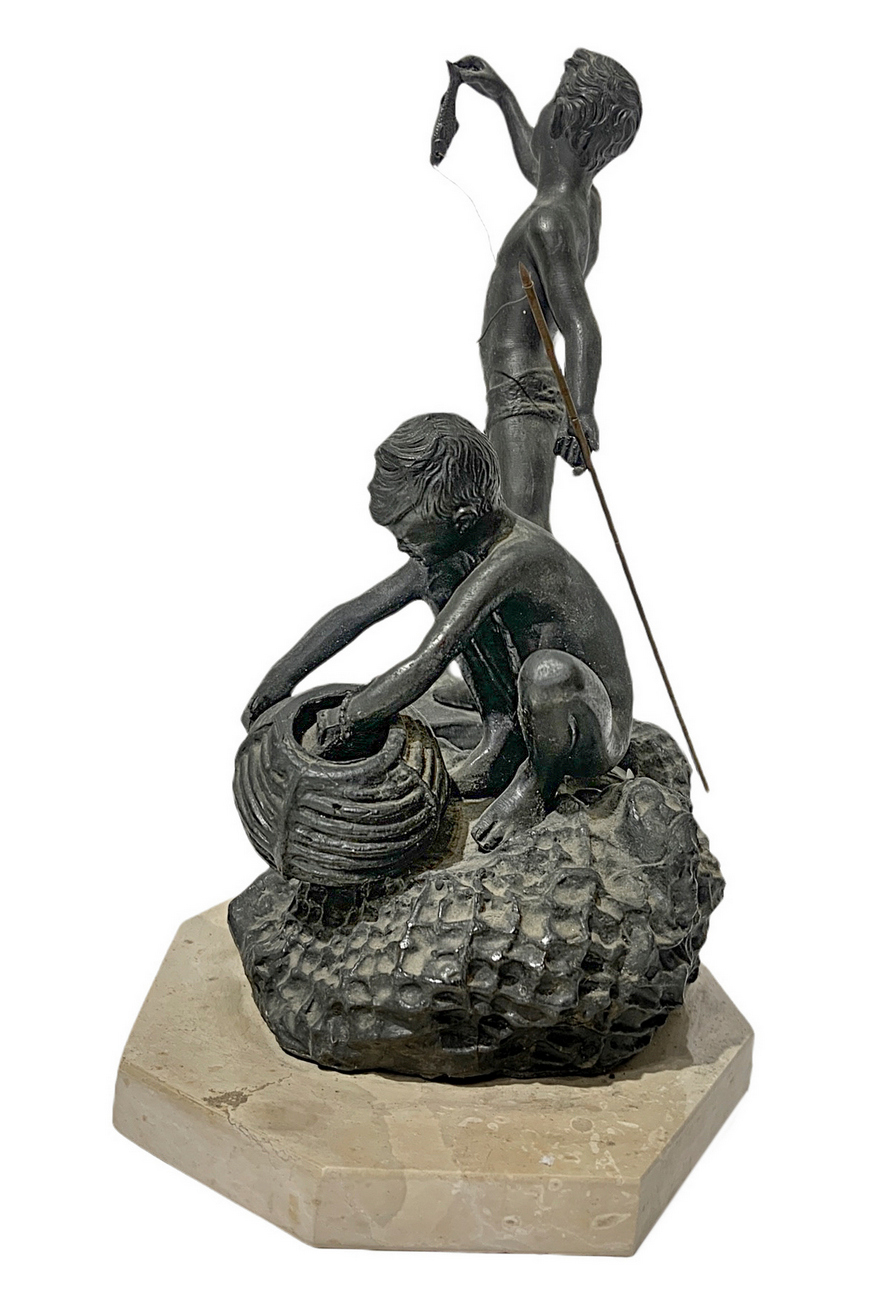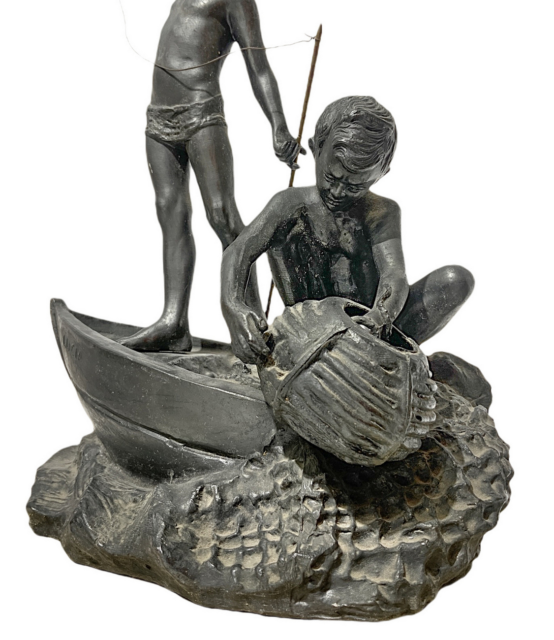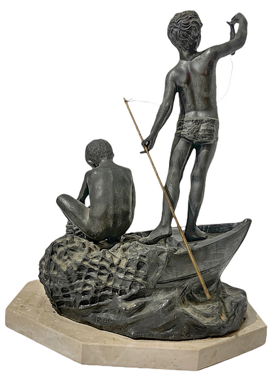 Lotto 197 | Scultura in antimonio patinato bronzo raffigurante coppia di scugnizzi su barca. XX secolo. Firma sul retro P. Uccello.