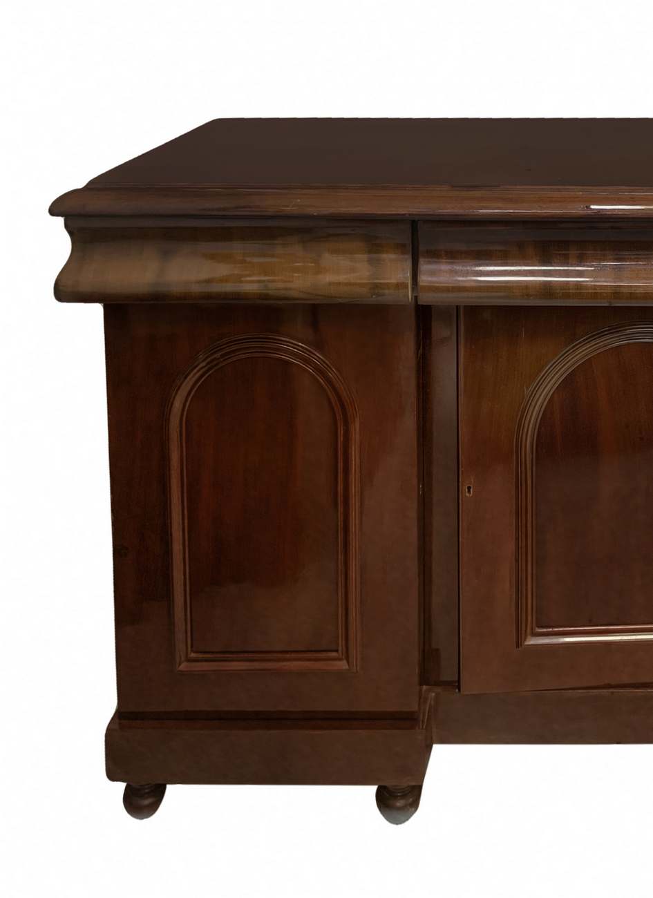 Credenza bassa vittoriana, in massello di mogano, fine XIX secolo. Tre ante inferiori e tre cassetti superiori piedi a pigna. H cm 104x170x60. Condizioni eccellenti