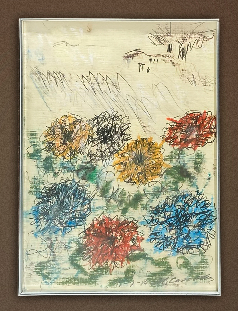 Cascella Michele (Ortona 1892- 1989 Milano) , dipinto a tecnica mista matita carboncino e pastello, carta applicata a tela raffigurante fiori, firmato e datato Michele Cascella 11/02/84. Cm 28x20, in cornice di legno argentata a foglia cm 62x47