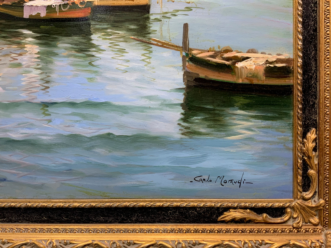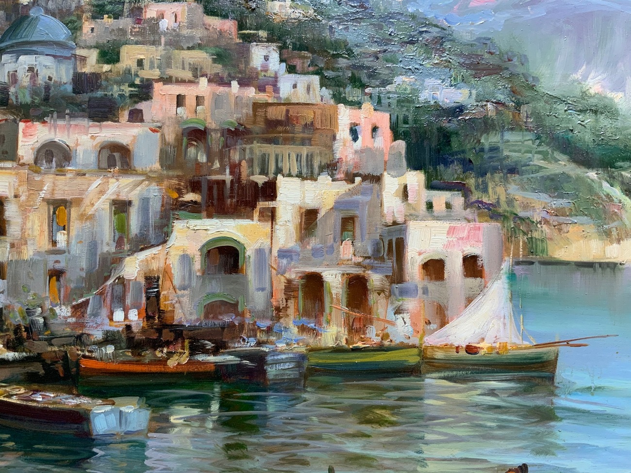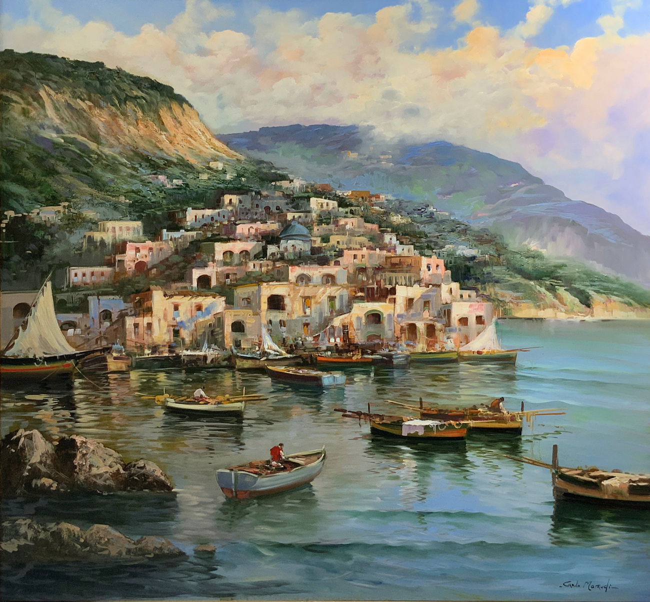Dipinto ad olio su tela “Procida” firmato Carlo Morandi. Cm 100x100, in cornice cm 127x127