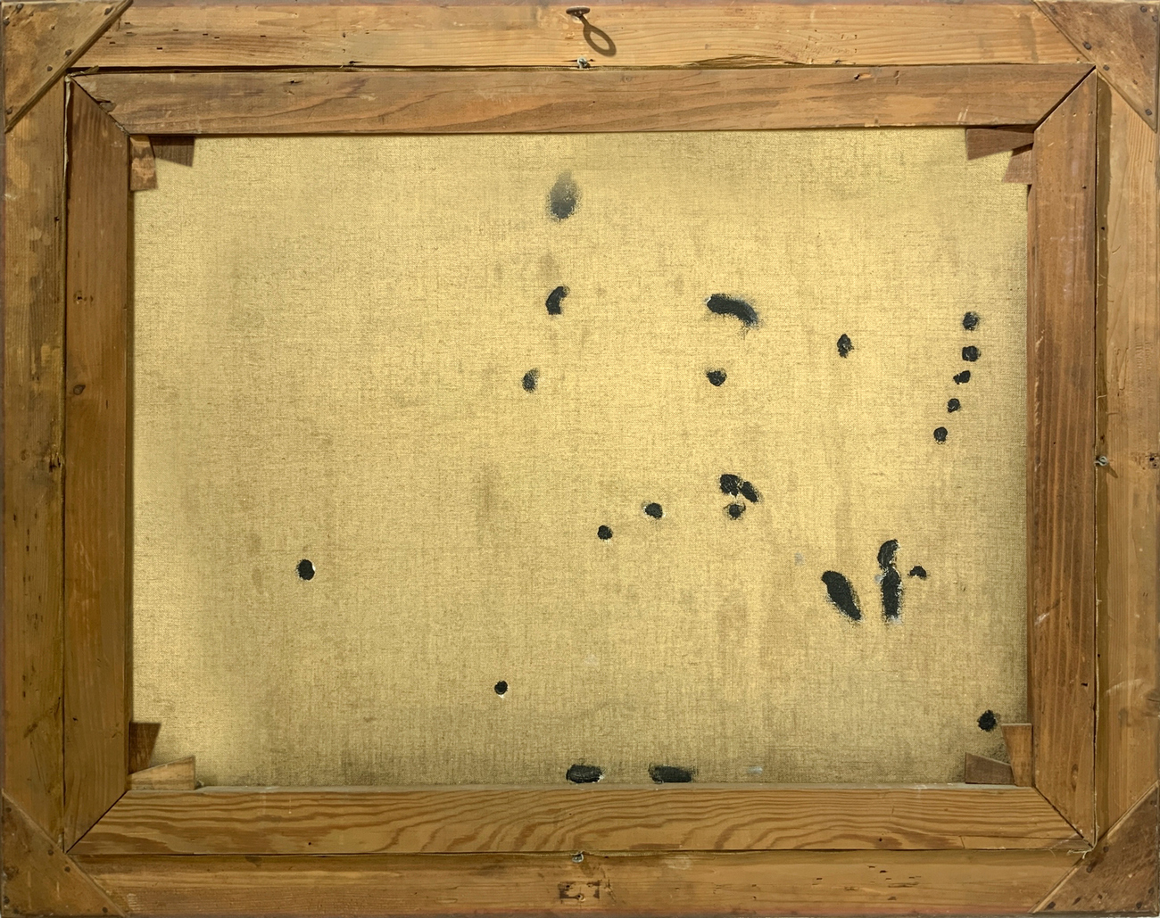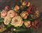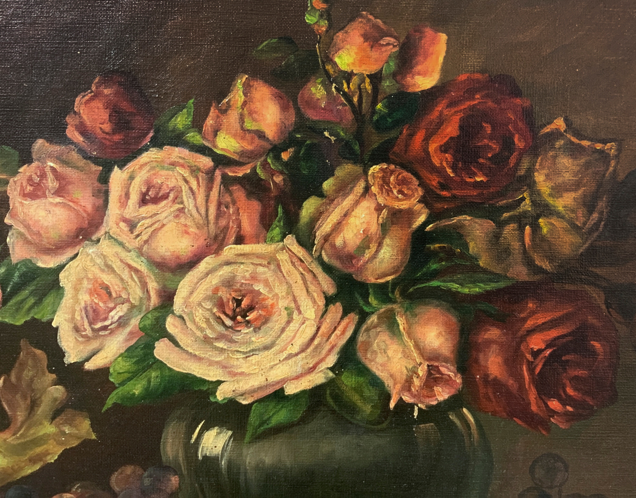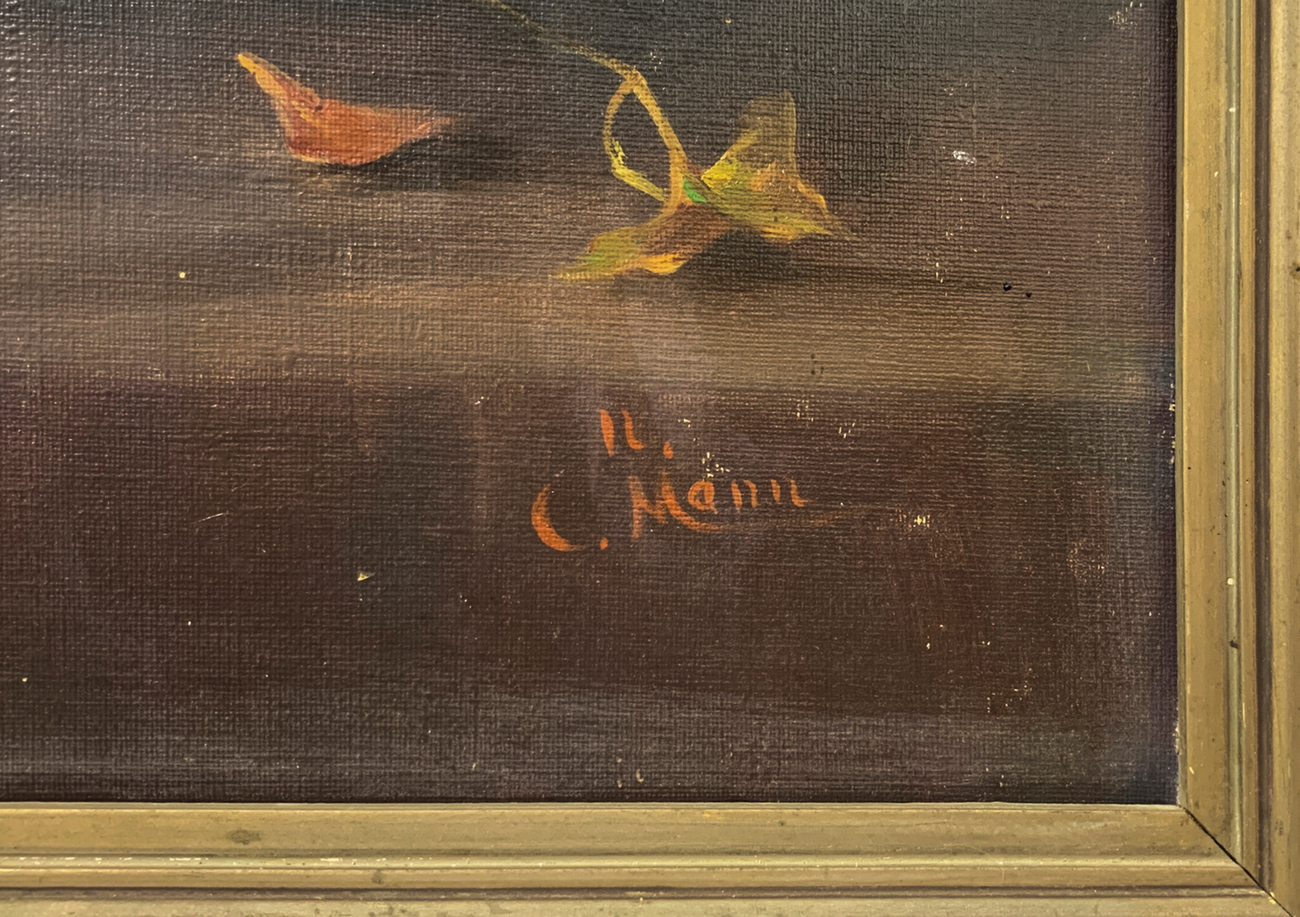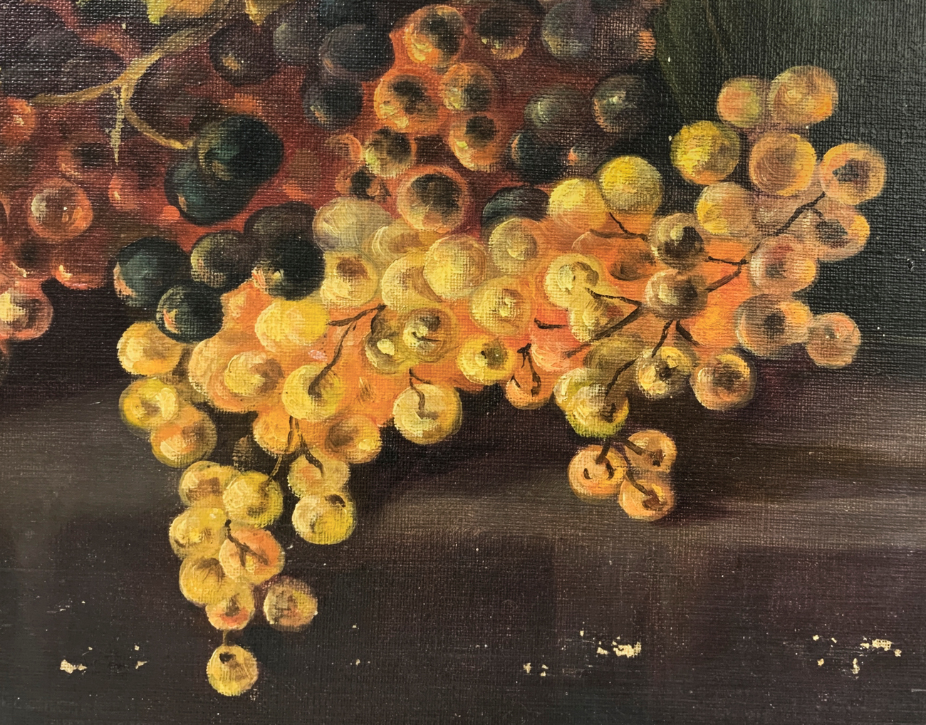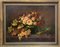 Dipinto ad olio su tela raffigurante natura morta di fiori e uva, inizi XX secolo, firmato C. Mann. Cm 60x80, in cornice cm 73x93