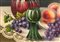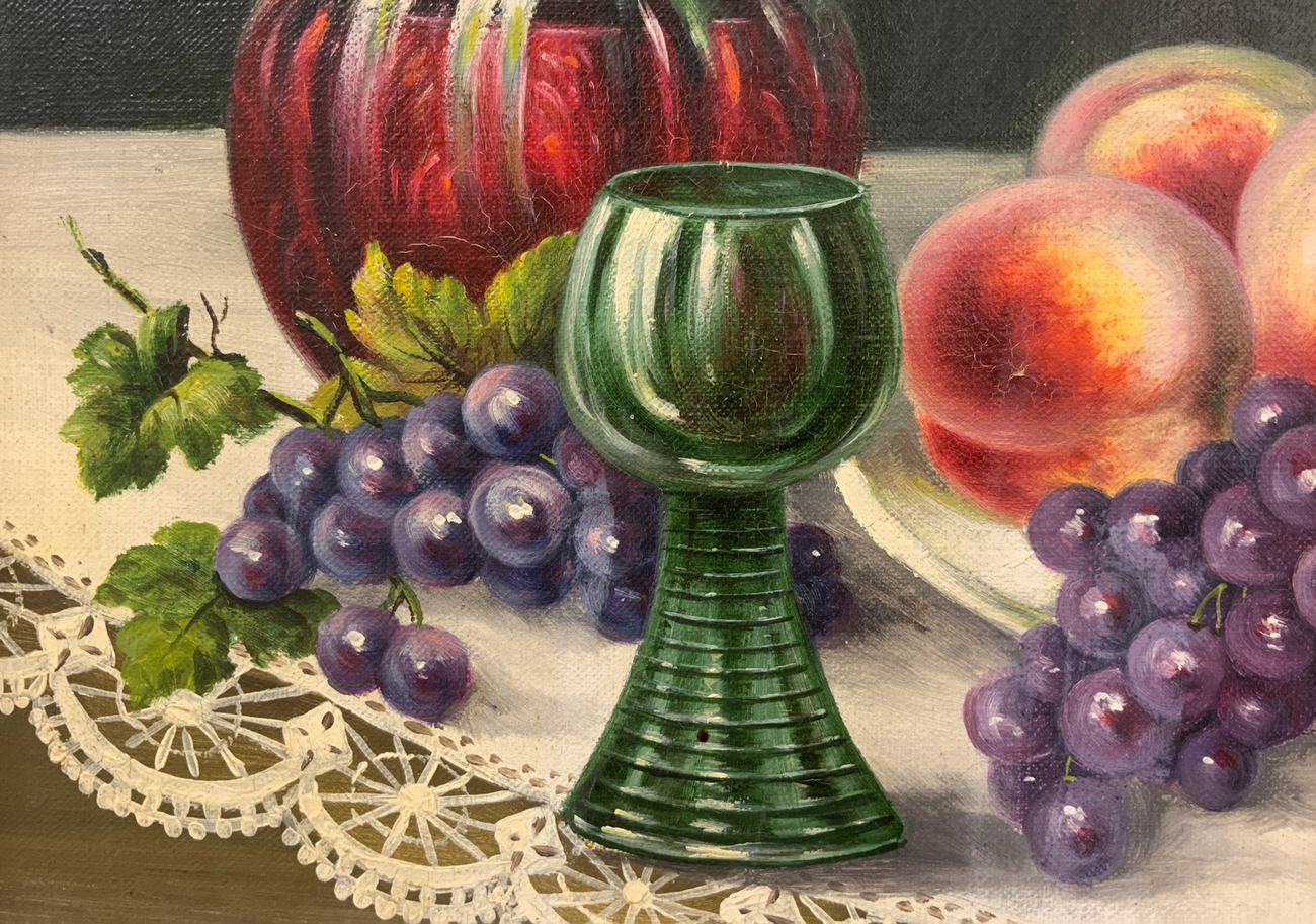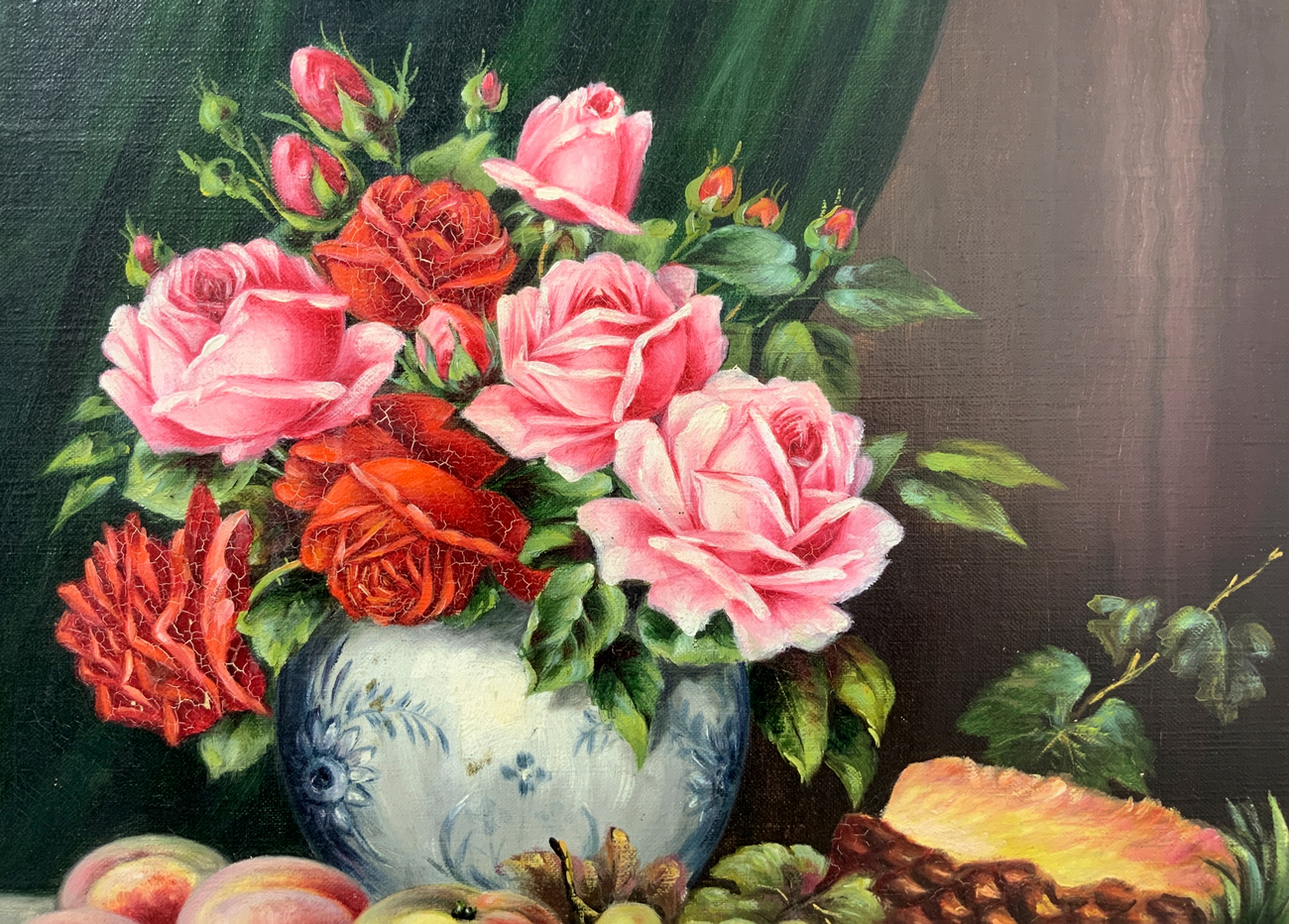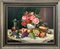 Dipinto ad olio su tela raffigurante natura morta con fiori in vaso e frutta. Firmato in basso a destra R. Uhse e datato