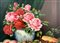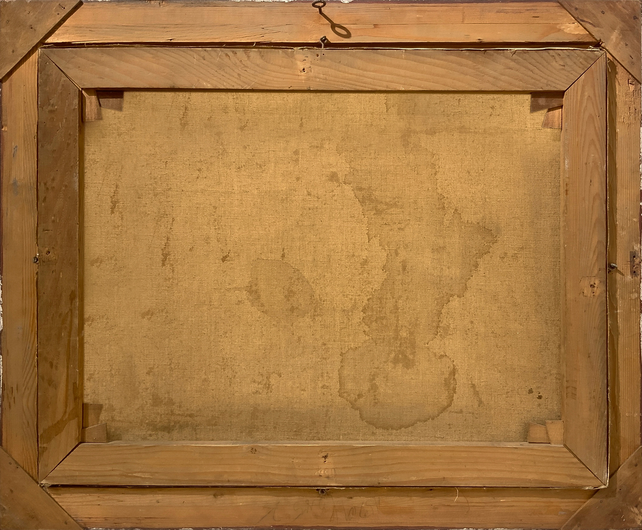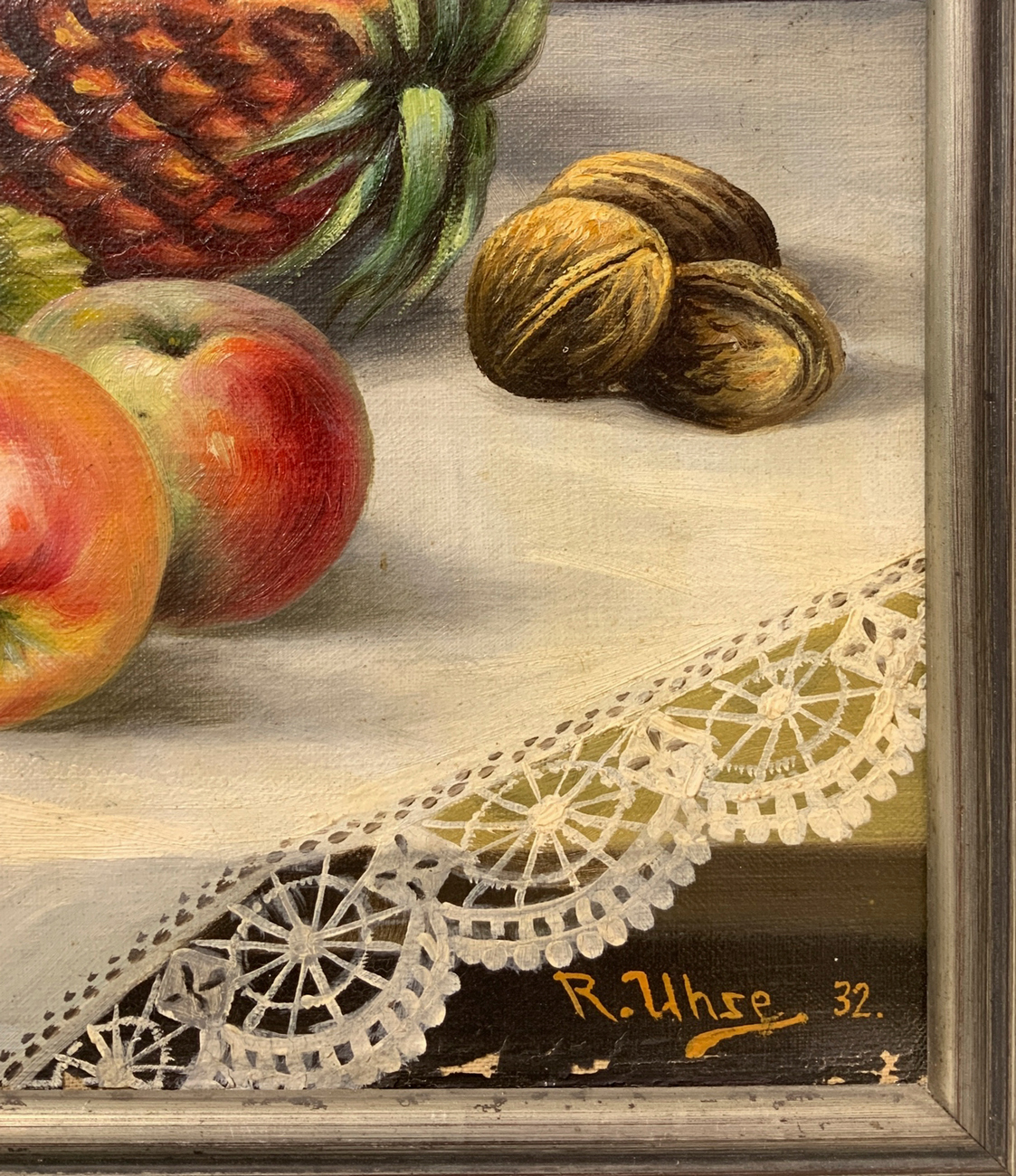 Dipinto ad olio su tela raffigurante natura morta con fiori in vaso e frutta. Firmato in basso a destra R. Uhse e datato ’32. Cm 50x65, in cornice cm 65x75