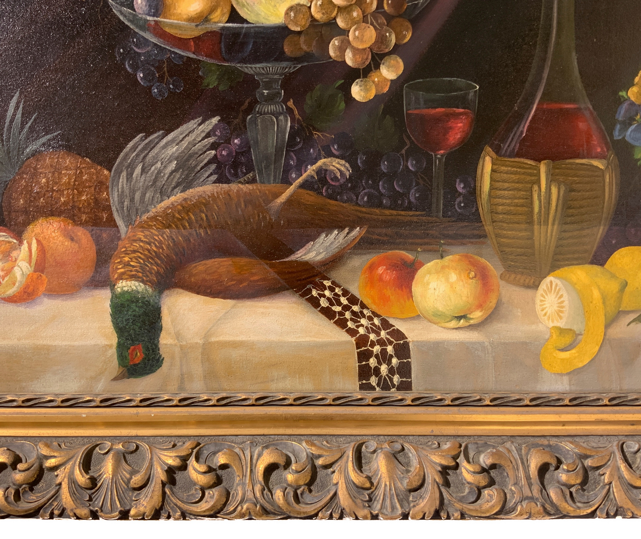Dipinto ad olio su tela raffigurante natura morta di frutta e cacciagione, firmata A. Schle e datato ’30. Inizi XX secolo. Cm 60x90, in cornice cm 80x110